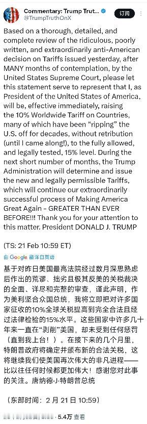 特朗普再次朝令夕改。特朗普昨晚(北京时间2月21日晚)发文写道:“基于对昨日美国最高法院经过数月深思熟虑后作出的荒谬、拙劣且极其反美的关税裁决的全面、详尽和完整的审查,谨此声明,作为美利坚合众国总统,我将立即把对许多国家征收的10%全球关税提高到完全合法且经过法律检验的15%水平。这些国家中许多几十年来一直在‘剥削’美国,却未受到任何惩罚(直到我上台!)。在接下来的几个月里,特朗普政府将确定并颁布新的合法关税,这将继续我们使美国再次伟大的非凡进程比以往任何时候都更加伟大!”   北京时间2月21日晚的这条发文,背后是美国最高法院2月20日作出的关键裁决,大法官们以6比3的多数意见,认定特朗普政府此前依据《国际紧急经济权力法》征收的大规模全球关税缺乏明确法律授权,裁定这些关税自始无效。   最高法院的判决划出了清晰的权力边界,法官们认为宪法赋予国会征税权,总统不能仅凭一部初衷为应对国际紧急状态、冻结外国资产的法律,就随意改写全国关税体系。这一裁决直接动摇了特朗普第二任期关税政策的核心支柱,还引发了数百亿美元的关税退款诉讼,包括开市客在内的数百家美国企业已纷纷起诉,要求退还此前缴纳的相关税款。   特朗普政府没有丝毫犹豫,20日当天就宣布将依据《1974年贸易法》第122条推出10%的全球关税,这项条款原本用于应对国际收支危机,最多只能持续150天,需国会批准才能延期。紧接着在21日,特朗普就将这一税率直接提升至15%,宣称新税率“完全合法且经过法律检验”,这种单日之内的政策加码,再次凸显了其决策的随意性。   特朗普口中“几十年来一直在‘剥削’美国”的说法,与实际数据并不相符。美国商务部19日发布的报告显示,2025年美国商品贸易逆差达到创纪录的12409亿美元,同比增长2.1%,这一数据说明此前的关税政策并未达到减少逆差的预期。纽约联邦储备银行的分析更指出,关税相关经济成本近90%都落在了美国企业及其客户身上,普通消费者和小企业承受了实实在在的负担。   多国已迅速作出反应,德国总理默茨计划前往华盛顿会谈,明确表达关税对各方的损害,德国还将与欧盟成员国协商统一立场。法国正联合欧盟伙伴磋商应对,欧盟已准备好包括出口管制、服务关税在内的反制工具,还有超900亿欧元美国商品的反制方案可供启用。韩国总统府也已召集会议,密切关注美方动向并保持与企业沟通,同时继续与美方磋商以维护自身出口利益。   特朗普政府宣称接下来几个月将颁布新的合法关税,但新政策的法律基础仍存在不确定性。《1974年贸易法》第122条从未被如此大规模动用,其150天的期限意味着若无法获得国会支持,政策将面临再次调整。而美国国内的分歧也日益明显,此前就有报道显示白宫内部在关税问题上存在严重争论,不同利益集团的反弹正在持续发酵。   这种频繁变动的关税政策,不仅让美国企业难以制定长期经营计划,也给全球贸易秩序带来了极大不确定性。企业需要应对不断变化的成本核算,供应链布局被迫频繁调整,而普通消费者最终都会通过涨价的商品承担额外负担。特朗普政府试图通过关税手段重塑贸易规则,但从实际效果来看,这种缺乏稳定预期的政策反而加剧了内外矛盾,既没能解决美国自身的经济问题,也损害了其与贸易伙伴的关系。   特朗普的这次关税加码,本质上是在最高法院划定的法律边界内寻求政策延续,但这种仓促调整的做法,只会让其关税政策的“朝令夕改”特征更加突出。国际社会正在密切关注美国接下来的政策走向,而美国国内的企业、消费者和立法机构,也将在未来几个月内持续对这一政策产生影响,这场围绕关税的博弈还远未结束。