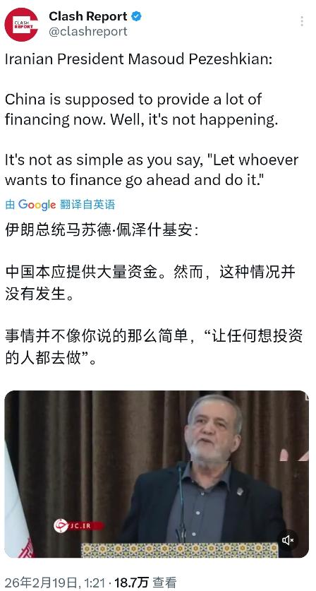 伊朗总统马苏德·佩泽什基安今天(北京时间2月19日)表示:“中国本应现在就提供大量资金援助的,然而,这种情况并没有发生。事情并不像你说的那么简单,‘让任何想要出资的人去行动就行’。” “让任何想要出资的人去行动就行”,这句话显然低估了国际间资金支持的复杂程度。伊朗总统马苏德·佩泽什基安北京时间2月19日的公开表态,把中伊之间的资金合作话题推到了公众视野中心。 他提到中国本应现在就提供大量资金援助但情况未发生,这番话背后藏着的其实是国与国合作中必须面对的现实逻辑,绝非“想出资就出资”那么简单。 中国对外援助始终遵循明确的原则和规范。根据国家国际发展合作署发布的《对外援助管理办法》,中国的对外援助坚持量力而行、尽力而为的准则,同时强调相互尊重、平等相待,不附加任何政治条件。 这意味着任何一笔援助资金的拨付,都需要基于双方的共同协商,结合受援国的实际需求和中国的国力情况综合考量。中国本身仍是发展中国家,国内在民生、基建、科技等领域还有大量投入需求,不可能脱离自身实际情况提供无条件的大规模资金援助。 中伊之间的合作从来不是单一的资金援助模式,而是以互利共赢的务实合作为核心。2025年中伊贸易额已经突破千亿大关,中国在伊朗的投资涉及32个项目,总金额超过500亿美元。 德黑兰-马什哈德铁路的建设、7GW光伏电站的落地、石油贸易中人民币结算的推进,这些都是中国用真金白银为伊朗经济注入的动力。 这些合作项目不同于直接的资金援助,它们更注重帮助伊朗提升自主发展能力,通过基础设施建设和产业合作,从根本上增强伊朗的经济韧性。这种“授人以渔”的合作方式,远比单纯的资金注入更具长远价值。 佩泽什基安的表态也折射出伊朗当下的经济困境。长期以来,伊朗面临外部制裁带来的经济压力,资金链紧张的问题日益突出。 美国近期向中东派遣双航母战斗群,美伊第二轮谈判未能达成共识,这些外部因素让伊朗的经济形势更加严峻。 在这样的背景下,伊朗对外部资金支持的迫切性显著提升,这一点值得理解,但将这种迫切需求转化为对中国的单方面期待,显然忽视了国际合作的基本逻辑。国与国之间的合作必须建立在相互尊重和共同意愿的基础上,不能将自身需求等同于对方的义务。 中国与伊朗的合作始终在稳步推进,只是合作的推进需要符合双方的程序和实际情况。中国对外援助资金主要包括无偿援助、无息贷款和优惠贷款三种类型,不同类型的资金有明确的使用范围和审批流程。 无偿援助主要用于减贫、减灾、民生等领域,优惠贷款则侧重支持有经济效益的生产型项目和基础设施建设。 这些资金的分配需要经过项目储备、可行性研究、双方协商等多个环节,不可能在短时间内完成大规模资金的拨付。中伊25年全面合作协议的落地本身就是一个系统工程,各项合作的推进都需要时间和耐心。 伊朗国内的政治格局也对中伊合作产生着影响。伊朗政坛存在改革派、保守派与革命卫队等多方势力的制衡,佩泽什基安作为改革派代表,其公开表态既包含着对中国的施压,也有安抚国内强硬派的考量。部分伊朗精英层将中国的支持视为理所当然,却对经济合作中的规则约束和项目落地效率缺乏足够重视。 恰巴哈尔港项目中,伊朗将部分泊位租予印度后吞吐量暴跌,而中方承建部分却实现增长,这种情况也影响着中国加大投资的信心。国际合作从来不是单方面的付出,需要双方共同维护合作环境,遵守合作规则。 中国始终愿意在平等互利的基础上与伊朗深化合作。2026年第一季度,中伊贸易中本币结算占比已经突破40%,这一成果帮助伊朗摆脱了对美元的依赖,有效绕开了外部制裁。 中国在伊朗能源、农业等关键领域的投入,正在帮助伊朗提升小麦自给率,解决能源短缺问题。这些合作成果的取得,正是基于双方尊重彼此国情、遵循合作规律的结果。未来,中国仍会继续推进与伊朗的务实合作,但这种合作必须建立在相互理解和共同努力的基础上,而不是单方面的诉求和期待。 国际社会的合作从来没有捷径可走,每一项成果的取得都需要双方的耐心沟通和诚意付出。佩泽什基安总统的表态让外界看到了伊朗对资金支持的迫切需求,但解决问题的关键在于回到平等对话的轨道上,尊重彼此的发展现状和合作规则。 中国对伊朗的支持始终如一,只是这种支持会以符合双方利益和实际情况的方式推进。相信随着中伊双方沟通的不断深入,各项合作会逐步落地见效,为两国人民带来实实在在的利益,也为地区的和平与发展作出贡献。