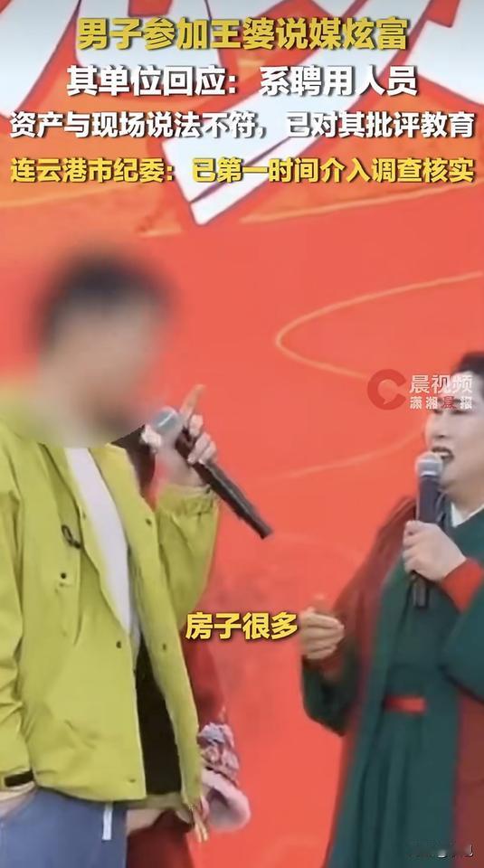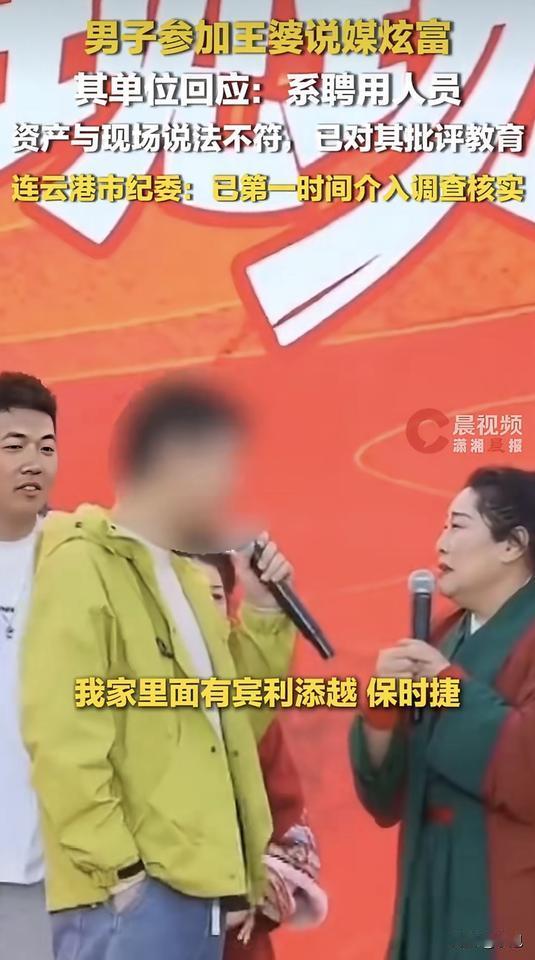 通报来了!2月20号,当时“王婆”在连云港园博园搞说媒活动。上去一个男的,穿个黄外套,张嘴就是“我在连云港市政府机关事务管理局上班,这是我本职工作”。 主持人王婆多精明,一听他提“副业”,赶紧打圆场说“副业不说了”,想让他下去跟姑娘私聊。结果这哥们来劲了,拦都拦不住,自己往外抖搂:家里有宾利添越、保时捷、奥迪R7,房子很多。 他这话一出,台下当时就炸了。现场视频流出来,网友直接开骂:一个机关单位的,哪来这么多钱?公务员还能搞副业?这不是往枪口上撞吗? 王婆当时那个表情,看视频都觉得尴尬,赶紧圆场说下去再聊。但这火已经点着了,压都压不住。 舆论闹这么大,当地纪委反应也快,直接就介入了。 等到22号,官方通报出来了。这一通报不要紧,简直是大型打脸现场。 连云港机关事务管理局的人说,这人确实是他们下属单位的,但根本不是他说的36岁,是86年的,今年都40了。 更逗的是他那几辆“豪车”。哪来的宾利保时捷?他手里就两辆车:一辆二手的奥迪A7,花14万8买的;另一辆是纳智捷,9万多块钱。 房子确实有两套,但一套70多平,一套93平,而且都是跟别人共有的,不是什么豪宅大院。 说到底,这就是一个40岁的中年男人,上了相亲台,为了给自己脸上贴金,把二手的奥迪A7吹成保时捷宾利,把70平的小房子说成豪宅遍地。 局里现在已经对他进行了严肃批评教育。 这事怎么看?有人说他是吹牛不打草稿,为了找对象脸都不要了。也有人琢磨,他为什么敢在台上这么吹?不就是因为“机关单位”这四个字有分量吗?他想用这个身份给自己的“实力”背书,结果玩砸了。 其实最该琢磨的是,他明明就是个普通聘用人员,一个月挣多少大家心里都有数。他为什么觉得自己说“家里有宾利”能唬住人?到底是相亲市场太现实,还是这身份标签太好用? 现在好了,婚没相成,全国人民都知道他开纳智捷了。你说他冤不冤?