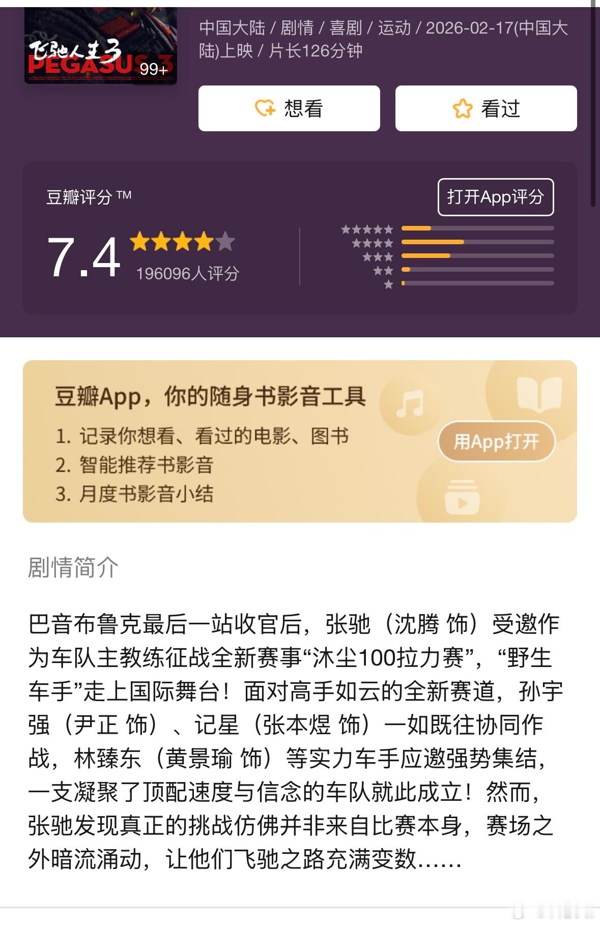 已经有超19.6万人打分,飞驰人生3豆瓣评分降至7.4