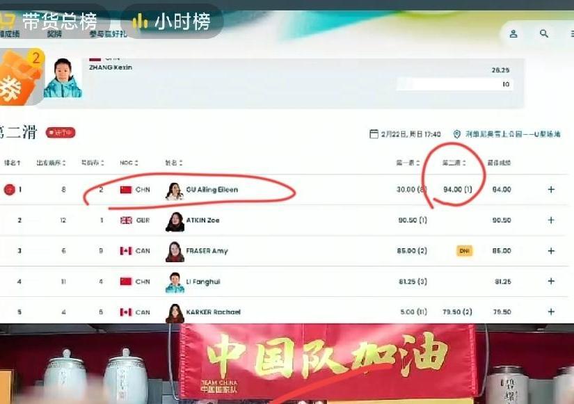 谷爱凌太牛了!快闭幕了,中国第5金来了!第二跳94分,第一名!第一跳出现严重失误,仅30分情况下,正常情况下选手都会面临巨大心理压力,可是谷爱凌,再次发挥出越挫越勇的超能力!94接近满分,几乎锁定了冠军!中国其他三名选手,发挥都不是很好,也希望他们在接下来的第二跳、第三跳有好成绩,争取拿奖牌!谷爱凌还有第三票,继续加油!