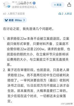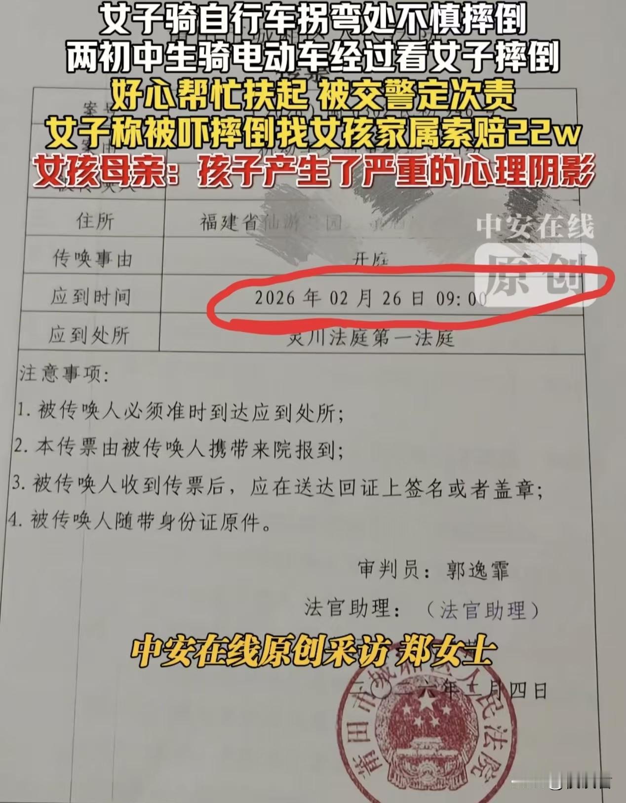 关于“福建莆田初中女生好心扶老太太反遭索赔22万”这事儿,很多人好像进入了一个误区,都以为这22万是判决后的金额,但是索赔≠判赔! 在此次事件中,22万这个数字实在太过于醒目,而且从视频中来看,老太太摔得并不重,即便老太太体弱骨头僵硬,但这么摔一下也不至于花费22万的医疗费,即便加上误工费营养费精神损失费,也远达不到22万。 所以,在看到这个数字的之后,很多人的想法都认为这个老太太是狮子大开口,小女孩家长应该反告她敲诈勒索。 另外很多新闻媒体又将这个数字和“小女孩好心扶老人”这几个字深度绑定,网友们就更加义愤填膺了,这些都是可以理解的。 可是就偏偏有部分网友认为这22万是判决后的结果,可是这事还没开庭呢,这事原本是定在2026年2月26日开庭,又怎么会有22万赔偿的判决结果呢? 22万这个是起诉金额,最终还要看法院怎么判,最终金额是要根据老太太的医疗费以及责任划分,来酌情判理的。 已知老太太从住院到完全康复花费共计26700.54元,按照次责10%-30%的责任划分,小女孩家长只需要赔偿几千元。 而且无依据漫天要价,夸大损失,甚至可能构成虚假诉讼罪,面临罚款、拘留。 现在有些新闻媒体和自媒体作者故意将“次责”和“22万”放在一起,很难不怀疑这是在故意带节奏,让人误以为这是判决后的结果。