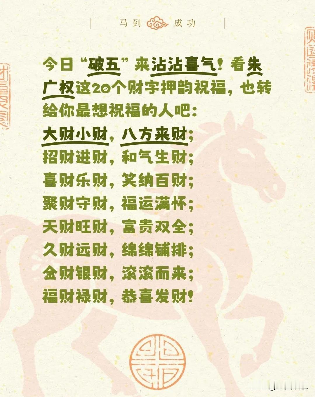 “押韵狂魔又营业了”! “破五”迎财神,央视名嘴朱广权连用20个“财”字祝福刷屏,网友直呼但这场年度“财富狂欢”背后,藏着更深的思考:我们真的靠谐音梗就能招财吗? 从“财源广进”到“财貌双全”,朱广权的创意祝福像一场语言游戏,却精准戳中大众对“暴富”的集体渴望。心理学家指出,这种仪式感本质是“积极心理暗示”,能短暂缓解焦虑。但真正的财富逻辑藏在行动里:“财”字的另一面,是“才”能、“裁”决与“采”纳机遇。 今年“破五”,不妨把20个“财”当成新年计划触发器:学技能、理财务、抓风口。毕竟,好运从不是单押韵脚,而是押注自己的成长。你准备先实现哪一个“财”?