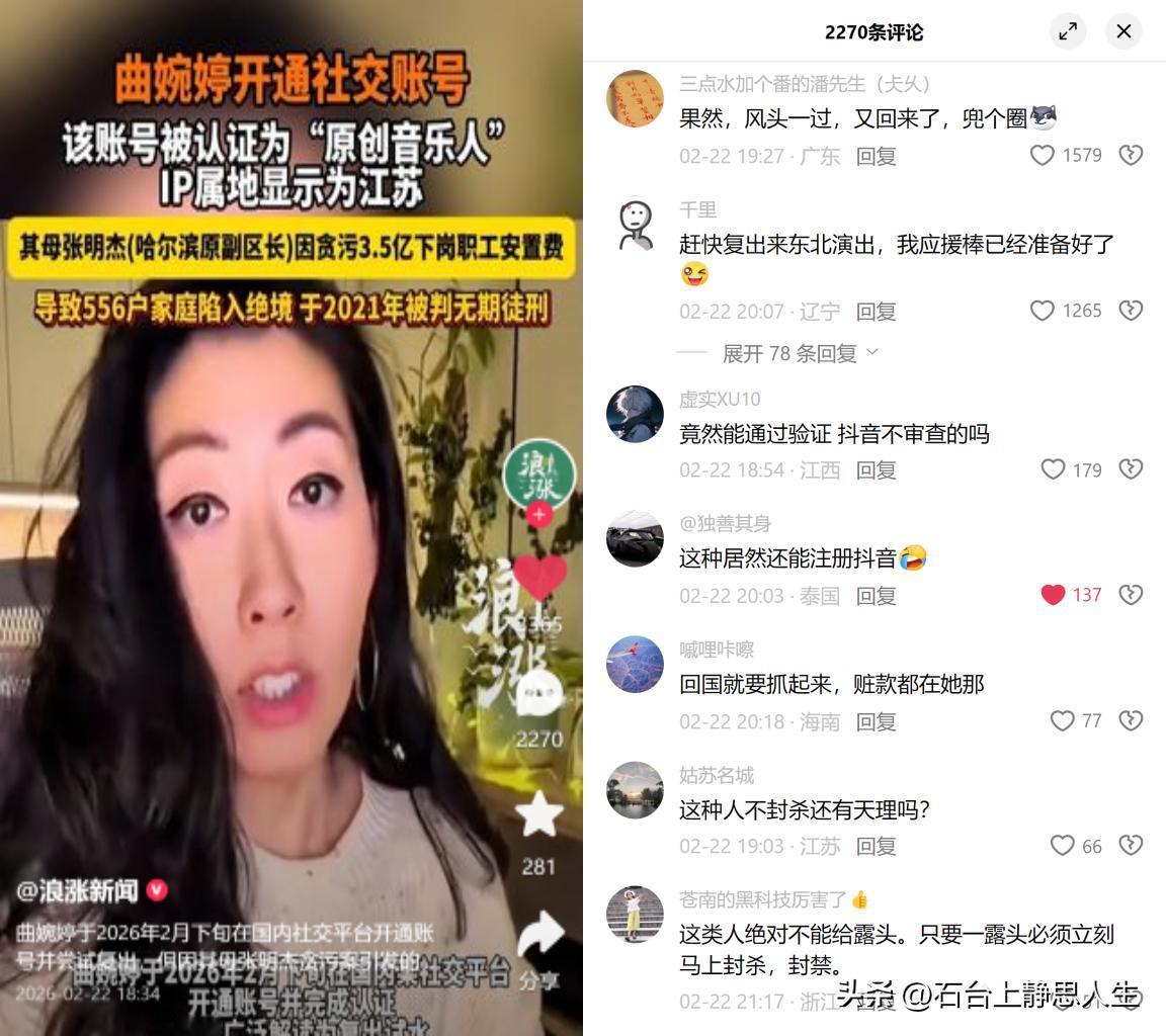 曲婉婷试水国内平台复出 她妈张明杰贪了3.5亿下岗职工安置费,害得556户家庭走投无路,判了无期至今没退赃。 她拿着这笔赃款在加拿大过奢靡生活,如今居然敢在国内开账号想带货,IP显示江苏疑似代运营,刚上线就被骂到关了留言功能。 就想问一句,这账号到底怎么过的审? 现有规则对亲属涉贪未退赃的艺人根本没明确量化标准,平台审核全靠自行裁量,这不就是明摆着的灰色地带? 大家这么气愤真不是瞎闹,那些下岗职工的救命钱被她妈吞了,她倒好,舒舒服服花着赃款,现在还想回来割韭菜,这不是踩着受害者的尊严蹭流量? 大家愤怒的本质是规则不公平:为啥作恶者的亲属能游走在监管边缘,换作普通人沾点边早就被限制得死死的? 这哪里是复出试水,分明是对公众底线的公然挑衅,更是现有监管漏洞的照妖镜。什么时候能把这种间接吃人血馒头的情况堵上,才是给受害者像样的交代。