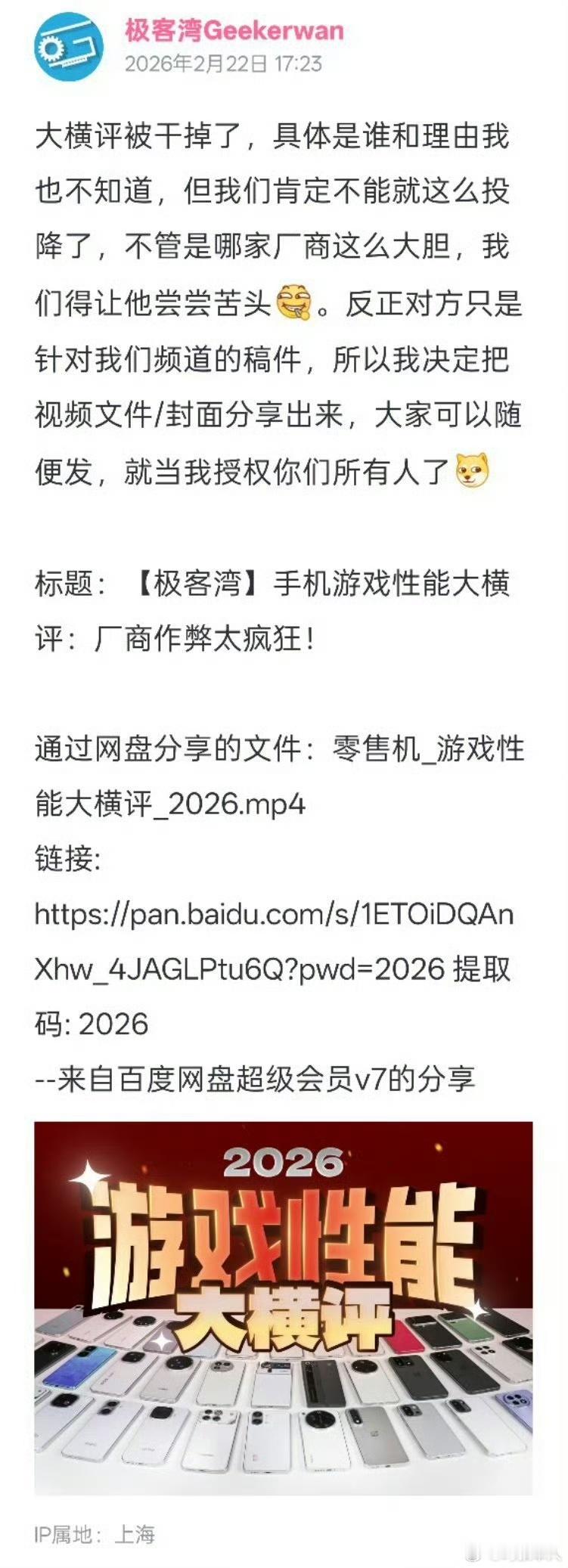 不擅长做产品,只擅长解决提出问题的人,走歪门邪道最拿手了,自家手机性能垃圾,给媒体送测的都是特调机,市售的帧率垃圾、功耗垃圾,这不就是虚假宣传+商业欺诈吗?!终于有一个独立测评媒体自己买了44台市售做了个手游性能大横评,发现问题了现在就联系平台删除,真是劣币驱逐良币。只有苹果最老实,表现一致,极客湾肯定清楚是哪家干的,现在也把内容直接用网盘公开了,都随便下……支持极客湾硬刚,这如果都能成常态,那国内的产品还能信吗?把对大家对国产产品信任消磨殆尽的就是这帮打着国产旗号的劣质品,如果自己做的垃圾还不允许别人给用户避雷,赶紧倒闭别丢人了……极客湾 下架