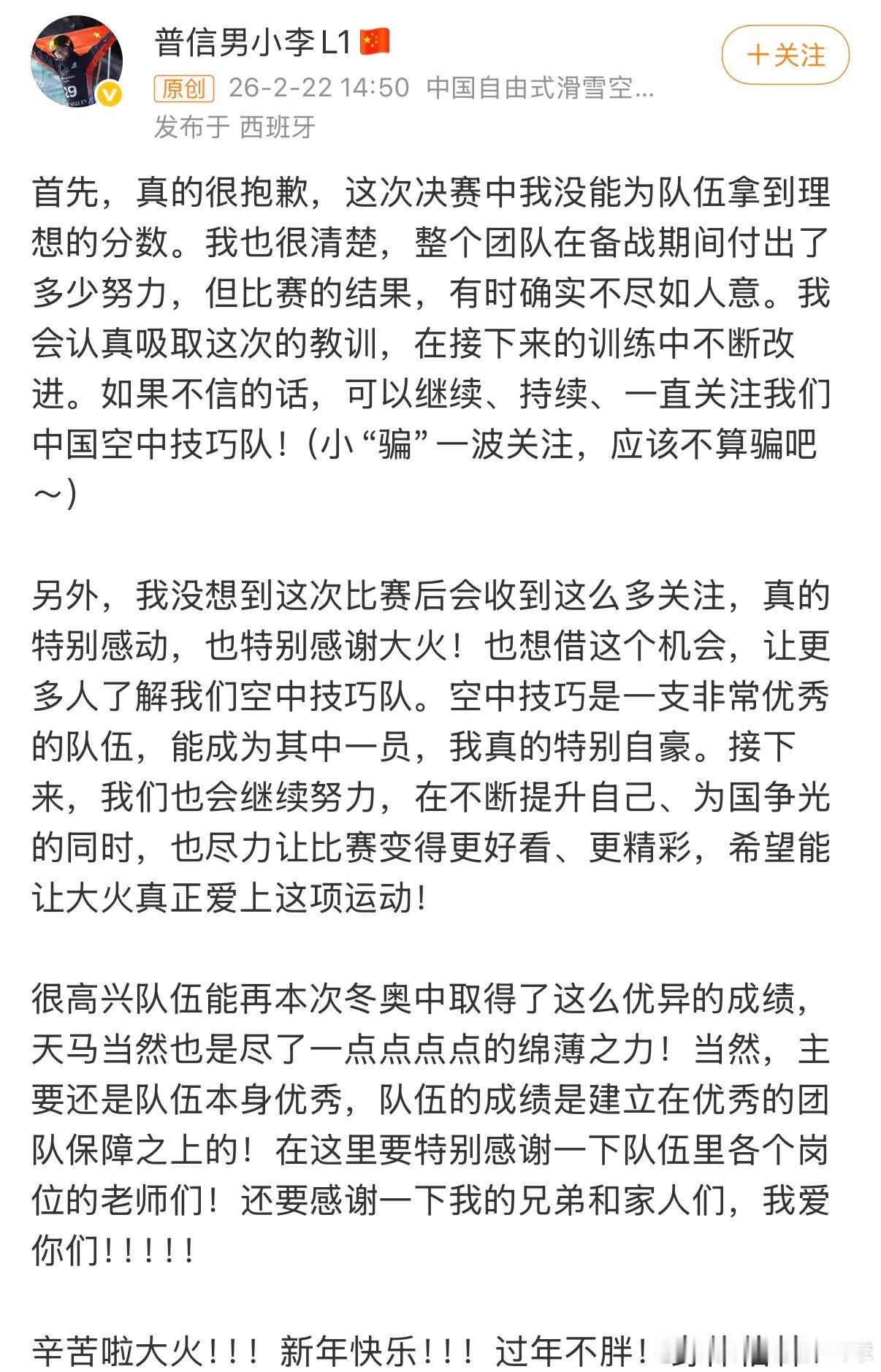 李天马又在发博时开玩笑了用玩笑化解遗憾,用幽默凝聚团队。一句“继续关注我们中国空中技巧队”,藏着对队友的信任和对未来的底气。真正的强大,从不是永不跌倒,而是跌倒后还能笑着招手:“下次,我们还在这儿等你。”