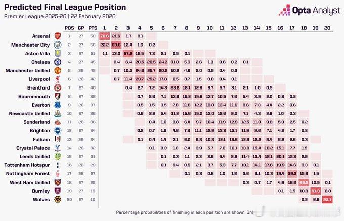 Opta在北伦敦德比前预测英超冠军概率🏆
