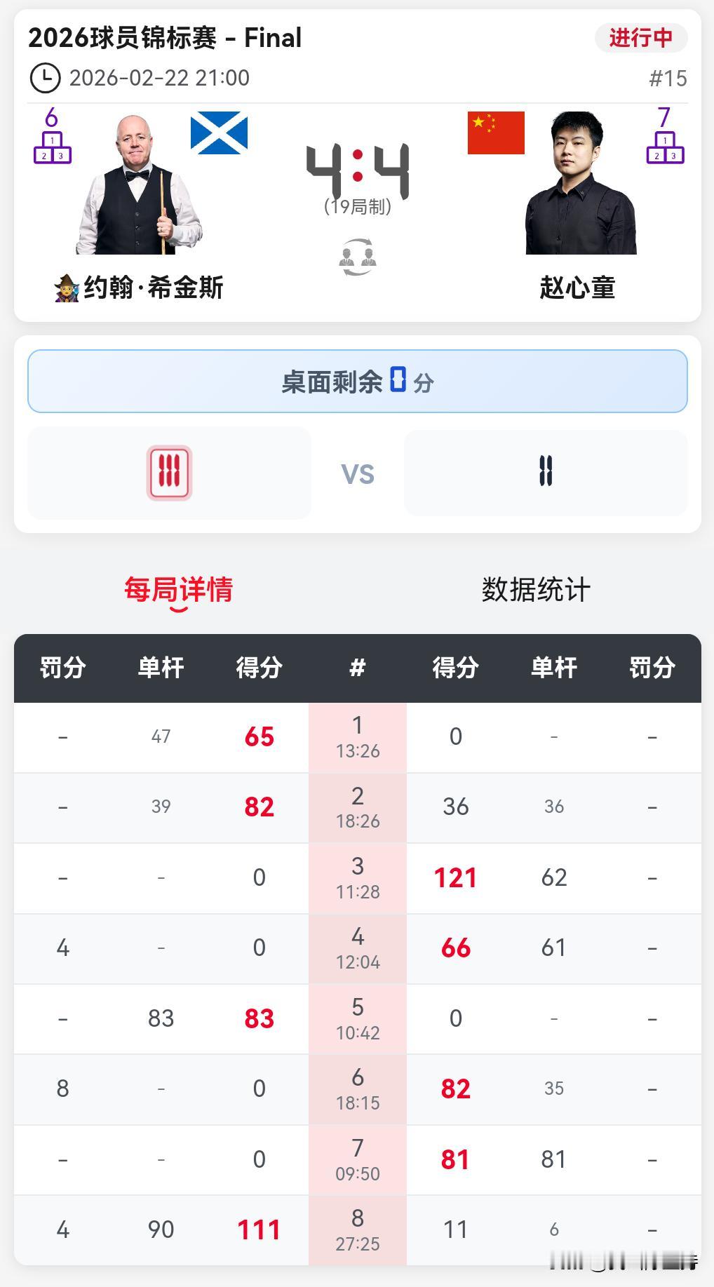 球员锦标赛决赛,赵心童对阵希金斯第一阶段打完,双方4-4打成平手。 看起来希金斯准备充足,精力充沛,精神焕发,一开始就取得了2-0的领先优势,而且敢打敢拼,也不保守,打出了顶级球员的水准。 赵心童则稍显疲惫,被挨了两闷棍之后,给予反击,长台准度还是在线,走位稍差。之前他解释是台呢走球很慢,2-2结束上半场。 下半场归来,希金斯打出83分单杆,比分来到3-2。赵心童连胜两局,其中第7局,球形不错,赵心童冲击147未果。第8局,赵心童失误过多,希金斯把比分扳成4-4。 第一阶段看起来,希金斯精力充沛,返老还童,进入状态非常快。赵心童要做好准备,阻挡希金斯第二阶段开始阶段拉开比分。 不过赵心童决赛经验也还不错,相信会做好准备。 第二阶段凌晨3点开始。
