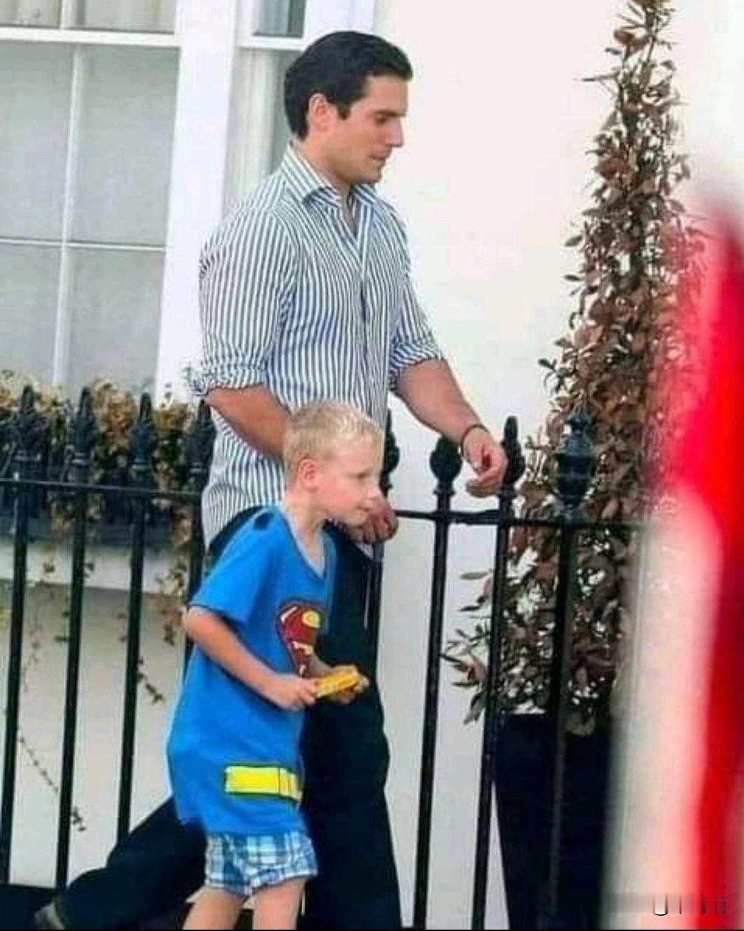 这张图片展示了好莱坞演员亨利·卡维尔 (Henry Cavill) 和他的侄子托马斯 (Thomas)。 事件背景 这张照片记录了一个在社交媒体上广泛流传的真实故事: 男孩的说法:当时7岁的托马斯在学校告诉老师和同学,他的叔叔是“超人”。 老师的反应:由于超人是虚构角色,老师认为他在撒谎并训诫了他,甚至告诉他的母亲学校不鼓励孩子说谎。 事实证明:为了证明侄子没有撒谎,曾在电影中饰演超人的亨利·卡维尔第二天亲自送托马斯去学校,从而证实了托马斯所言非虚。 在这张照片中,托马斯身穿一件蓝色的超人主题T恤,而亨利·卡维尔正走在他身边。