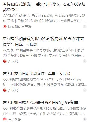 这个世界有3个国家,谁跟它同盟谁倒霉!一个是欧洲的意大利,意大利是历史出名的“猪队友”,口气特别大,一旦打仗谁都打不过,哪怕是比它小得多的小国也打不过,仅有一个手指头的胜利,也是在盟友的大力支持下惨胜的。 麻烦看官老爷们右上角点击一下“关注”,既方便您进行讨论和分享,又能给您带来不一样的参与感,感谢您的支持! 在国际同盟的舞台上,意大利向来是出了名的 “猪队友”,喊口号时底气十足,真到了战场上却屡战屡败,哪怕面对实力远逊于自己的小国,也难有胜绩。为数不多的胜果,也全靠盟友倾尽全力支援才勉强拿下,跟它结盟的国家,多半要被拖后腿。 从二战到冷战,再到如今的 21 世纪,意大利在军事作战和同盟责任承担上的表现,始终让盟友倍感无奈,从来都算不上一个可靠的合作伙伴。不管是轴心国还是北约,意大利的加入都没给同盟带来助力,反倒常让盟友为其收拾烂摊子。 1939 年二战全面爆发后,墨索里尼领导的意大利果断加入轴心国阵营,一心想跟着德国扩张势力,结果却屡屡掉链子。意大利率先对希腊发起入侵,本以为能轻松拿下这个小国,却遭到希腊的顽强抵抗,最终落得惨败的下场,前线部队节节败退。 不仅是希腊战场,意大利在北非的作战同样惨不忍睹。为了争夺北非的利益,意大利出兵与英军对抗,却因战术失误和战力拉胯多次溃败,大量武器装备被英军缴获,还丢了不少控制区域。走投无路的意大利只能向德国求援,让希特勒不得不分兵支援。 德国为了帮意大利稳住局面,派出了由隆美尔率领的非洲军团,这支部队兵力不足 10 万,跟德国东线战场的兵力规模相差甚远,却硬是帮意大利挽回了北非战场的颓势。可即便有德军加持,意大利部队还是战力拉胯,最终依旧没能守住北非,还连累德国东线战场陷入被动。 意大利的糟糕表现,不仅让自己在二战中颜面尽失,还成为了德国战败的重要诱因。因为分兵援助意大利,德国错失了拿下苏联高加索油田的最佳时机,石油补给陷入困境,东线战场的优势逐渐丧失,最终让整个二战的战局发生了逆转。 二战结束后,意大利加入北约,本应承担起同盟的军事责任,可在冷战时期的 1970 到 1980 年代,它的表现依旧让人失望。作为北约成员国,意大利身处南欧前沿,本应承担起南欧的防御部署任务,却总找各种借口推脱。 意大利常以国内财政预算紧张、民众反战舆论强烈为由,回避北约在南欧的关键军事行动,对于同盟的军事部署要求,要么敷衍应对,要么直接拒绝。同时意大利自身的军力建设也漏洞百出,装备更新缓慢,军队训练不足,战力始终处于下游水平。 进入 21 世纪,梅洛尼政府上台后,意大利在北约中的表现依旧没有改观,依旧是 “口头巨人,行动矮子”。在北约涉及中东和东欧的诸多军事行动中,意大利总是第一时间表态支持,喊出的口号十分响亮,可实际行动却寥寥无几。 在中东的军事行动中,意大利虽有派兵,却始终处于后方位置,投入的兵力和资源都十分有限;而在东欧的俄乌冲突中,梅洛尼政府明确表示支持乌克兰,却始终拒绝向乌克兰直接派兵,仅提供少量物资援助,让北约盟友不得不额外调配力量弥补缺口。 很多人会疑惑,为何意大利在同盟中始终表现拉胯,其实这背后有着多重原因,既离不开现实的实力限制,也受历史传统和社会价值观的深刻影响。首先是军事实力和经济支撑的双重不足,这是意大利难以成为可靠盟友的核心原因。 意大利的经济发展常年处于低迷状态,公共债务占 GDP 的比例早已超过欧盟警戒红线,2025 年的国防预算虽有增长,却仅占 GDP 的 1.57%,远未达到北约要求的 2%。有限的经济实力,让意大利根本无力支撑大规模的军力建设和军事行动。 其次是意大利分裂的历史传统,从罗马帝国覆灭后,意大利就陷入了长期的分裂状态,北部和南部的发展差距至今悬殊。北部经济发达,南部贫困落后,南北矛盾根深蒂固,这种内部的分裂让意大利难以形成统一的国家意志,更难集中力量承担同盟责任。 意大利南北发展的不平衡,还导致国内政治派系林立,各种意见难以统一,在面对国际同盟的军事要求时,往往因国内的政治博弈而难以做出果断决策。同时南部的黑手党势力庞大,进一步拖累了经济发展,也让国家的治理效率大打折扣。 除此之外,意大利重视国内生活的社会价值观,也让民众对海外军事行动普遍缺乏热情。意大利人更注重生活品质,对于参与海外战争、承担同盟军事责任的意愿极低,反战舆论始终占据主流,这也让政府在做出军事决策时,不得不顾及国内的民意。 从二战的轴心国到如今的北约,意大利始终没能摆脱 “猪队友” 的标签,其表现也让盟友清楚地认识到,想要依靠意大利承担重大的战略任务,基本是不可能的事。如果继续保持这样的状态,意大利未来在国际同盟中,依旧会是那个让盟友头疼的存在。