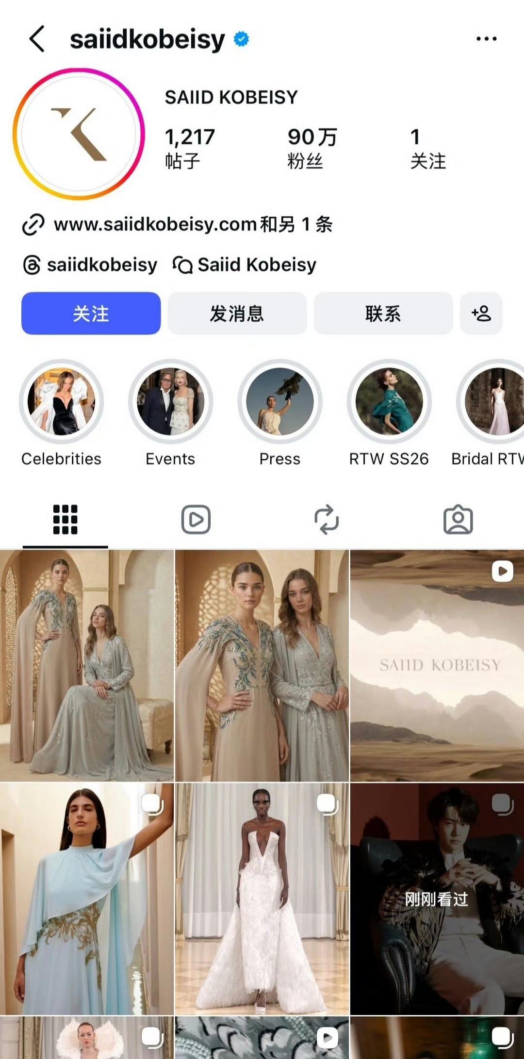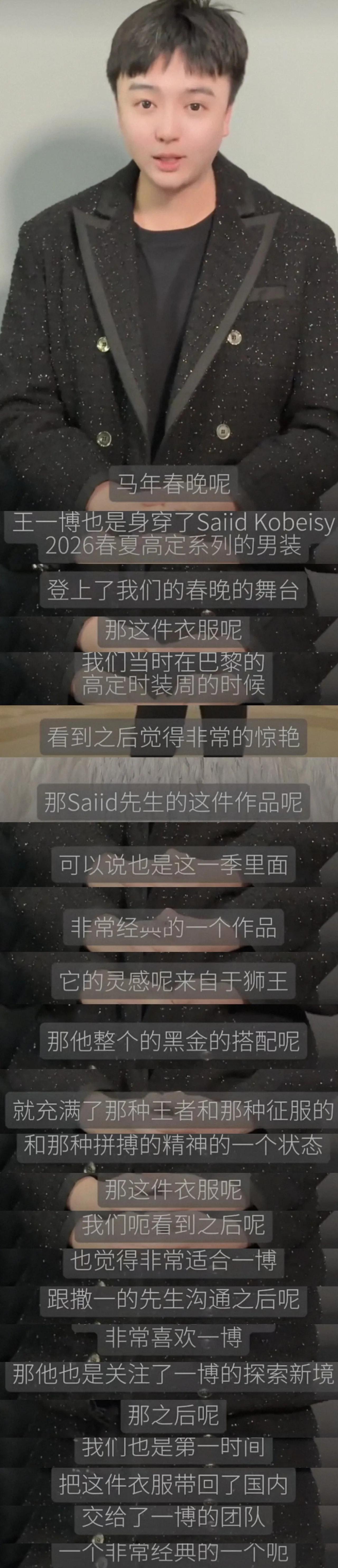 Saiid Kobeisy品牌ins官博认领王一博2026春夏高定出席中国春晚活动。 并且,Saiid先生非常喜欢王一博也关注了王一博的《探索新境》系列。