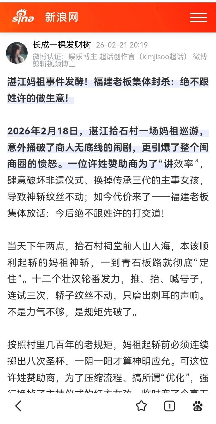 2026年2月18日,湛江拾石村一场妈祖巡游,意外捅破了商人无底线的闹剧,更引爆了整个闽商圈的愤怒。一位许姓赞助商为了“讲效率”,肆意破坏非遗仪式、换掉传承三代的主事女孩,导致神轿纹丝不动;如今代价来了——福建老板集体放话:今后绝不跟姓许的打交道!