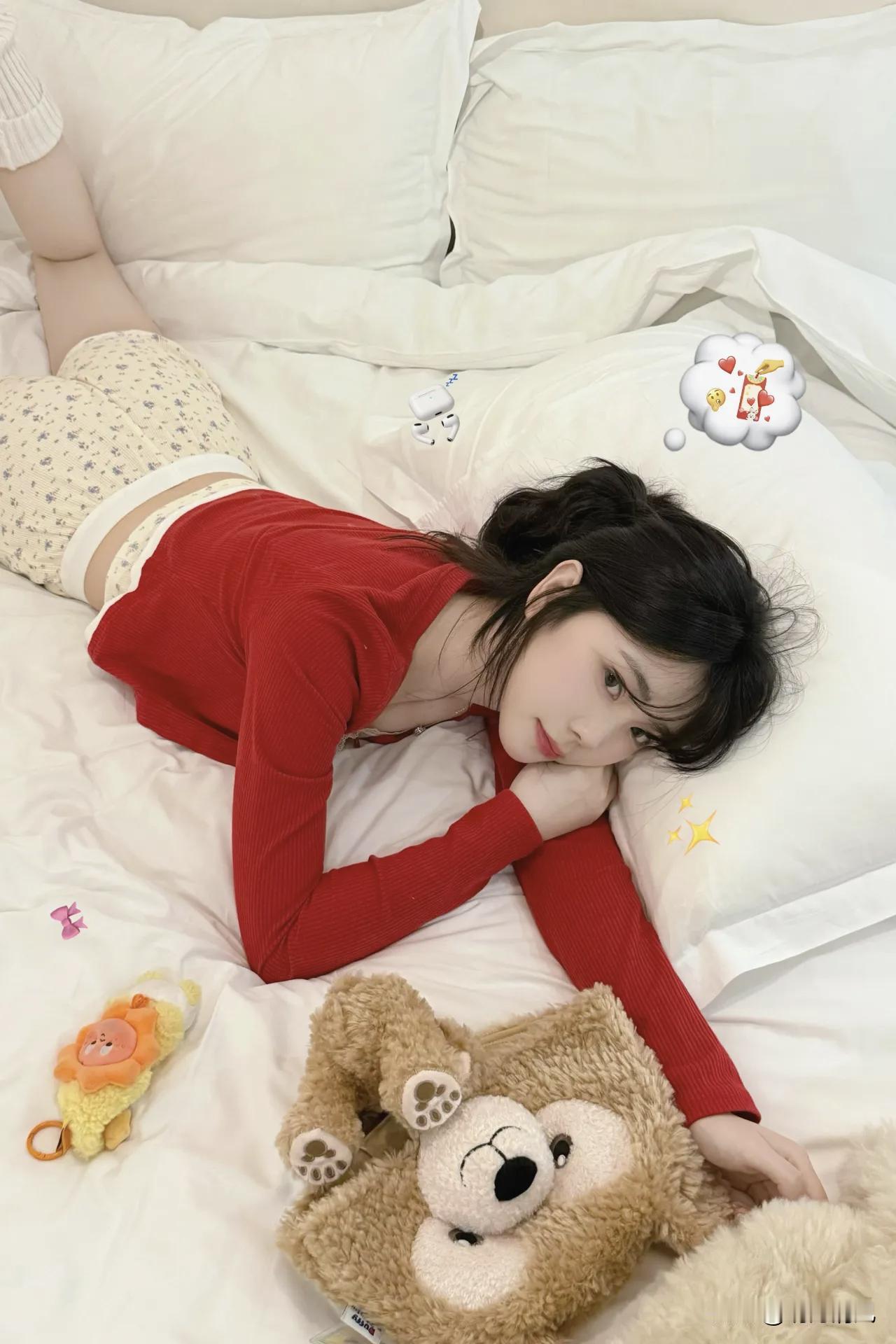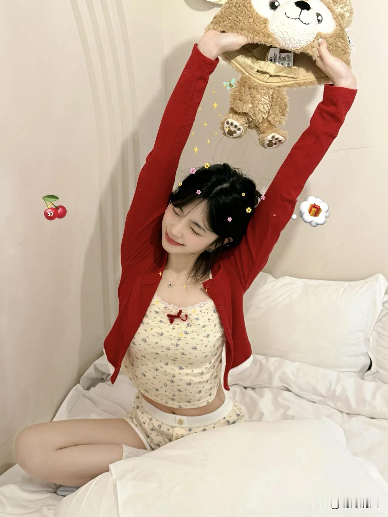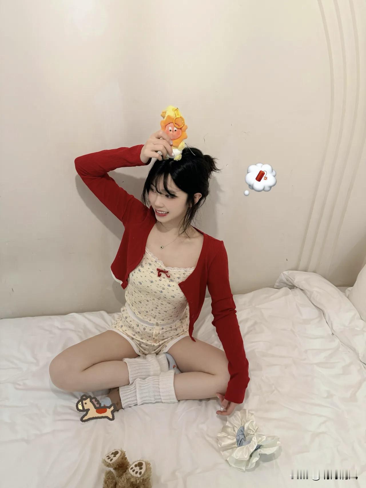 这组照片我自己还蛮喜欢的,红配白真的好适合过年啊。白床单当背景简直万能,显得人干净又柔和。我身上这件红开衫是故意的,在白色上面红得特别抓眼,里面搭了个碎花吊带,有点小性感但又不会太刻意。 硬要挑一个最喜欢的动作的话,应该是那张“举高高抱玩偶”😆 就是盘腿坐在床上,把毛绒玩偶使劲举过头顶那种。整个人身体拉长,红开衫的袖子也跟着垂下来,显得手臂线条特别好看。我当时闭着眼睛笑的,完全没看镜头,反而特别自然。颈链上的小坠子刚好落在锁骨那里,闪光灯下会有一点点反光,细节感就有了。 其实拍照不用太复杂,找个舒服的姿势,让衣服的颜色在背景里跳出来,就已经赢了80%。剩下那20%?交给光线和心情吧。 新年生活图鉴新年拍照 红色系穿搭