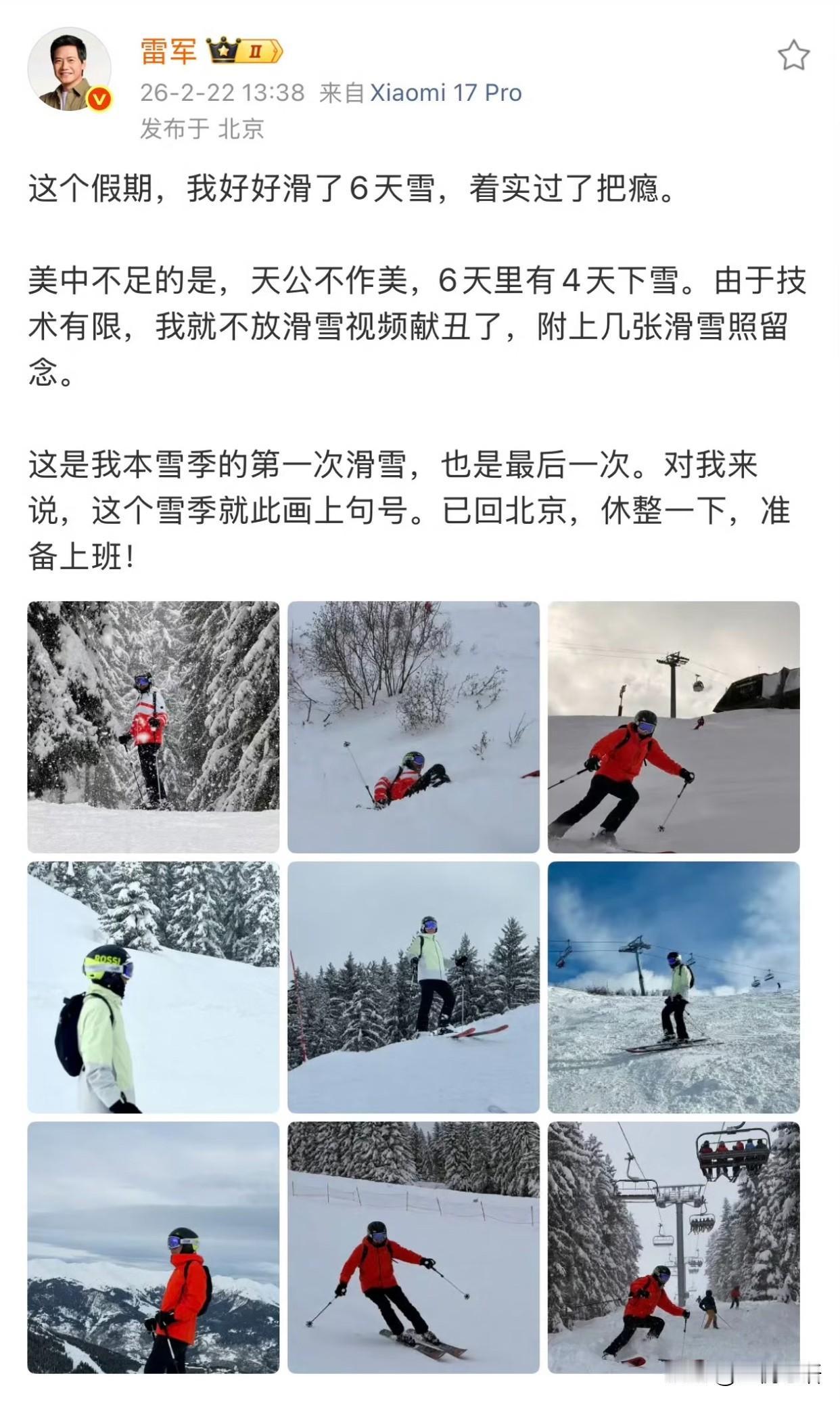 57岁雷军太会玩了! 春节假期连滑6天雪,过足滑雪瘾。 6天里4天下雪,天气不给力, 却挡不住他的热情,还幽默自嘲技术一般。 网友直呼: 小米什么时候做年轻人的第一块滑雪板, 把滑雪用品的价格打下来! 劳模也有松弛感,工作拼命玩也尽兴, 这状态真的太让人羡慕了!
