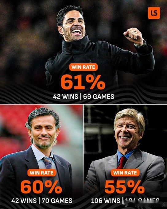 🥇 61% —— 阿尔特塔(69 场 42 胜)🥈 60% —— 穆里尼奥(70 场 42 胜)🥉 55% —— 温格(194 场 106 胜)