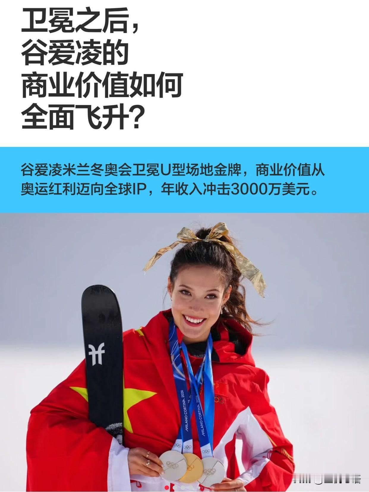 谷爱凌米兰冬奥卫冕U型池金牌, 真的太厉害了! 两届冬奥会拿了3金3银, 刷新了好几个历史纪录,妥妥的滑雪界传奇。 首轮失误才30分,后面直接逆袭拿高分锁定胜局,这实力真的没话说。 赛场超牛,商业价值也一路涨。 现在年收入2300万美元,几乎全是代言收入,妥妥的冬奥选手收入榜首。卫冕后全球代言费将上涨10%-20%,年收入直冲2530-2760万美元,中长期有望突破3000万美元。 她还特意精简了代言,只留核心品牌,顶奢和国民品牌都有,选得特别稳。 我觉得她最难得的是, 她不只是个奥运冠军。 学霸、模特、公益大使, 多身份加持,活成了独一无二的全球IP。 卫冕后代言费还得涨,未来收入还能冲更高,这样的谷爱凌,火是真的有道理!