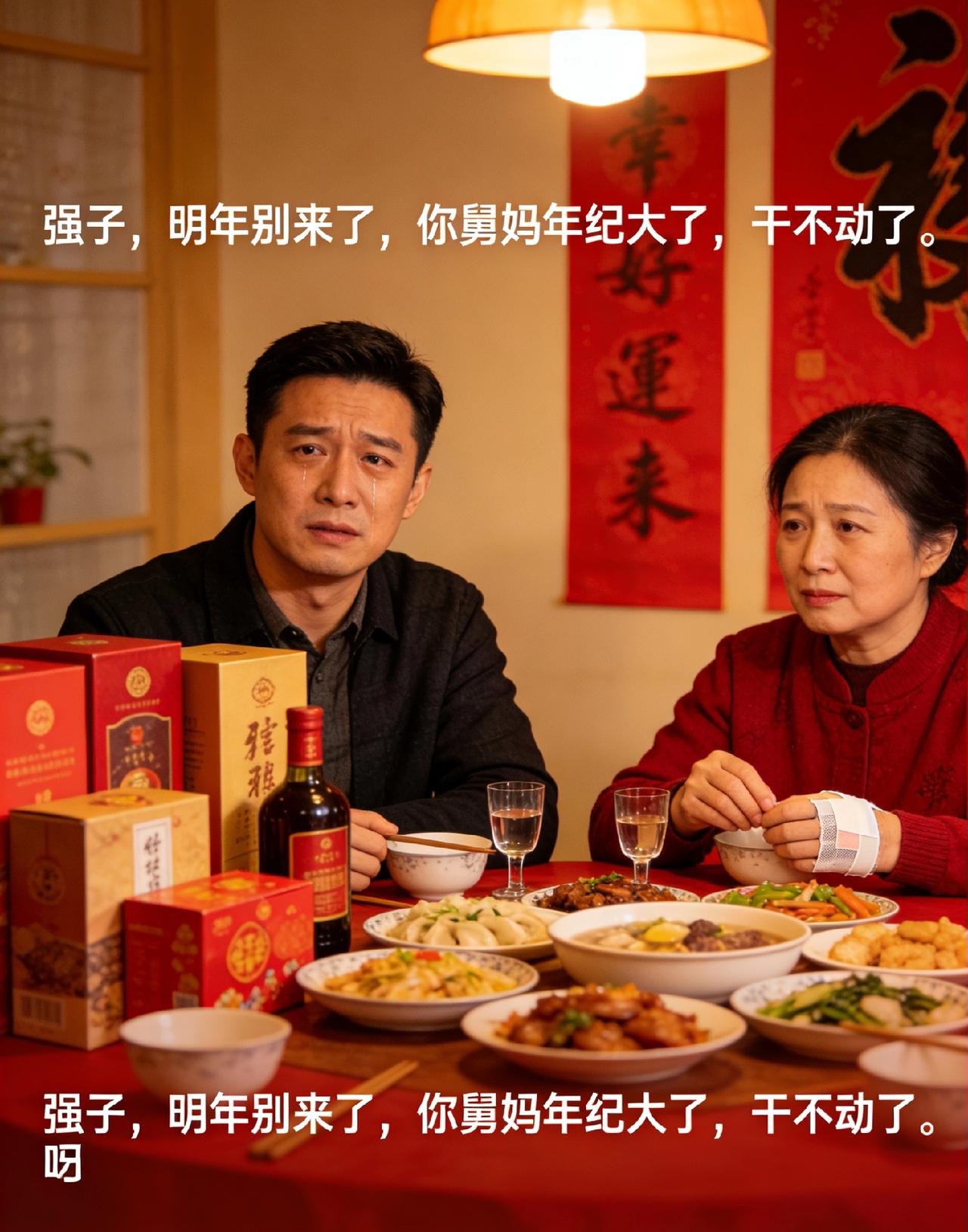 一句“明年别来了”,看哭全网!这才是中国式拜年最扎心的真相 大年初二,35岁的阿强带着年货去给舅舅拜年,这本是延续几十年的温情,却在饭后被一句话瞬间戳破,让无数人红了眼眶。 酒过三巡,舅舅放下酒杯,声音哽咽:“强子,明年别来了,你舅妈年纪大了,干不动了。” 不是不疼外甥,不是不盼团圆,是老人真的撑不住了。为了这顿团圆饭,舅妈从清晨忙到正午,洗菜切菜、炖肉蒸鱼,一桌菜端上桌,她的腰早已疼得直不起来,手上贴满膏药,连端碗都在发抖。 我们总以为,拜年就是拎着礼物上门,热热闹闹吃顿饭。可我们忘了,那一桌热气腾腾的饭菜,对年迈的老人来说,是透支体力的煎熬,是咬牙硬撑的体面。 他们怕怠慢亲人,怕晚辈失望,宁愿自己累到极致,也不肯说一句辛苦。直到实在扛不住,才由最心疼老伴的舅舅,说出这句最伤人也最无奈的话。 这件事刷屏后,评论区彻底破防。有人说,不是亲情淡了,是老人老了;有人感慨,我们总在理所当然地享受,却从未心疼过他们的付出。 真正的孝顺,从来不是形式上的走亲访友,更不是让老人用健康换来一顿饭。错峰拜年,不带负担;带上熟食,不让老人下厨;把长辈接到身边,换我们掌勺伺候;多塞红包,少添麻烦。 拜年,拜的是心意,不是负担;团圆,圆的是牵挂,不是劳累。别让最爱我们的人,在烟火里累到沉默。 趁亲人还在,别留遗憾。你有过让长辈操劳拜年的经历吗?评论区说说你的心里话。