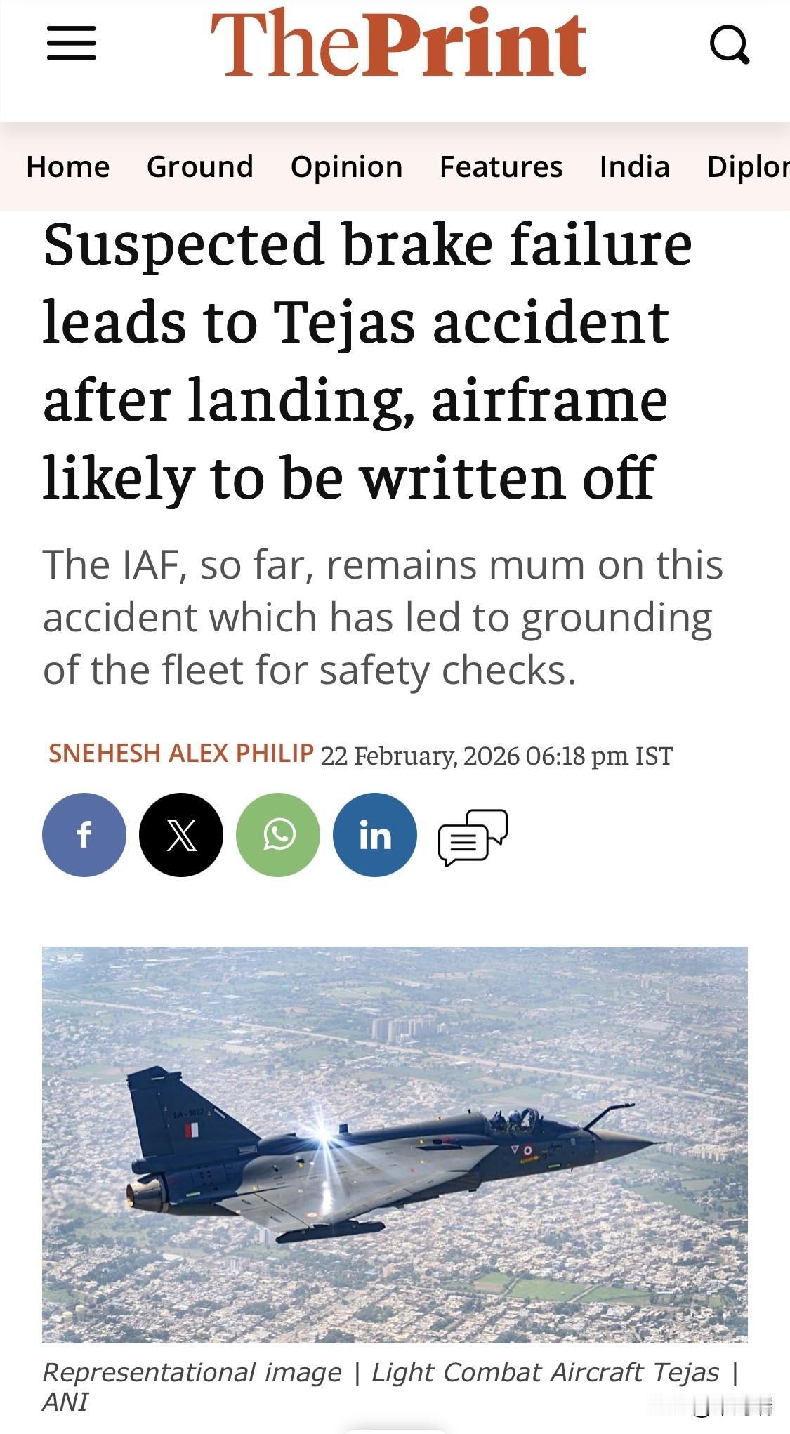 据多家媒体2026年2月22日报道,印度空军一架LCA“光辉”(Tejas)战斗机于本月早些时候在训练后的着陆过程中发生事故,标志着该型战机在过去23个月内发生的第三次重大损失事故。 根据目前的公开报道,近两年的三起事故分别为: 2024年3月12日:一架“光辉”战机在拉贾斯坦邦杰伊瑟尔梅尔(Jaisalmer)附近坠毁,这是该机型服役23年来的首次坠毁事故,飞行员安全跳伞。 2025年11月21日:一架“光辉”在迪拜航展(Dubai Airshow)进行飞行表演时坠毁,飞行员纳曼什·西亚尔(Namansh Syal)不幸遇难。 2026年2月7日(近期披露):一架“光辉”在某空军基地降落时,疑似因刹车故障或技术故障偏离跑道并冲入水沟。虽然飞行员安全逃生,但飞机机身严重受损,预计将报废(Write-off)。 最新进展 全线停飞检查:受此次事故影响,印度空军已决定暂时停飞整个“光辉”机队,以进行全面的技术检查和安全评估。 产量与交付压力:目前印度空军仅运营约32架Mk-1型战机,在短时间内损失3架引起了外界对该国产项目可靠性的高度关注。与此同时,改进型Mk-1A的交付也因通用电气F404发动机的供应问题而面临延迟。