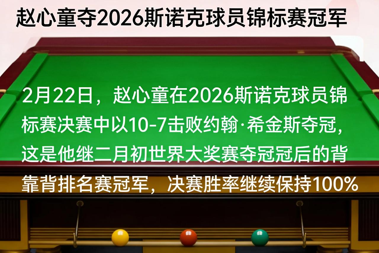 直接封神!赵心童夺2026斯诺克球员锦标赛冠军,丁俊晖都甘拜下风了! 北京时间2月23日凌晨,2026斯诺克球员锦标赛决赛落幕!中国名将赵心童以10-7力克传奇希金斯,强势摘冠!真的是牛逼克拉斯! 当决赛胶着至7-7平后,赵心童接连轰出四连鞭,单杆104、126两杆破百+六杆50+,进攻火力直接拉满,以无可争议的实力夺冠! ✅ 生涯第5个排名赛冠军 ✅ 本赛季第3冠+背靠背夺冠 ✅ 决赛6战6胜100%胜率 ✅ 球员锦标赛改制后中国首冠,创造历史! 准度碾压,心态平和,中国斯诺克再添荣耀!恭喜赵心童,未来可期! 赵心童夺2026斯诺克球员锦标赛冠军斯洛克赵心童