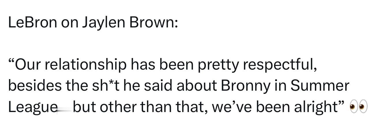 詹姆斯开玩笑表示:“除了他在夏季联赛里说了布朗尼的那些蠢话之外,我们的关系一直都挺互相尊重的……但除此之外,我们相处得还不错。” 👀