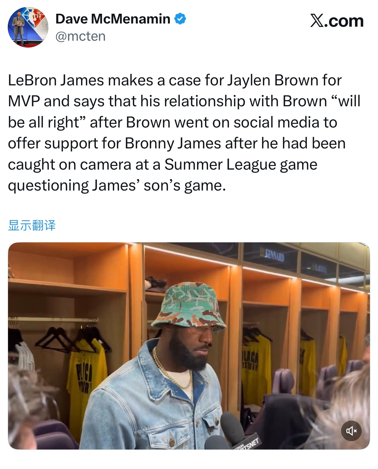 詹姆斯力挺杰伦·布朗获得MVP,并回应了此前关于布朗尼的争议。他表示,在杰伦·布朗通过社媒声援布朗尼之后,两人之间的关系“没问题了”。