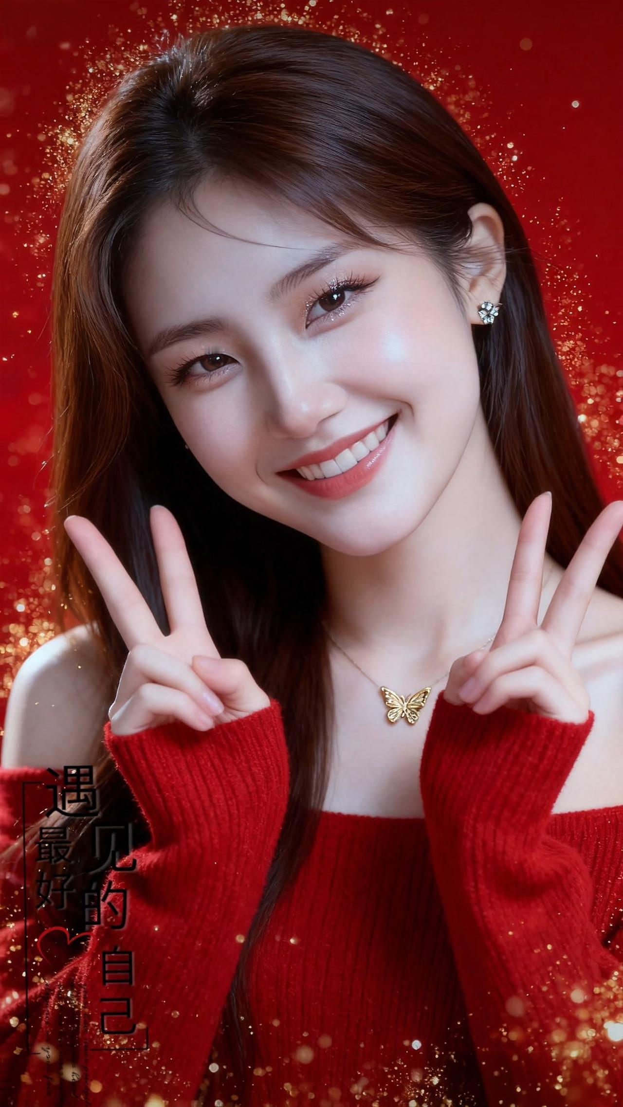 甜美笑容,红衣少女,闪耀耳环,温暖氛围