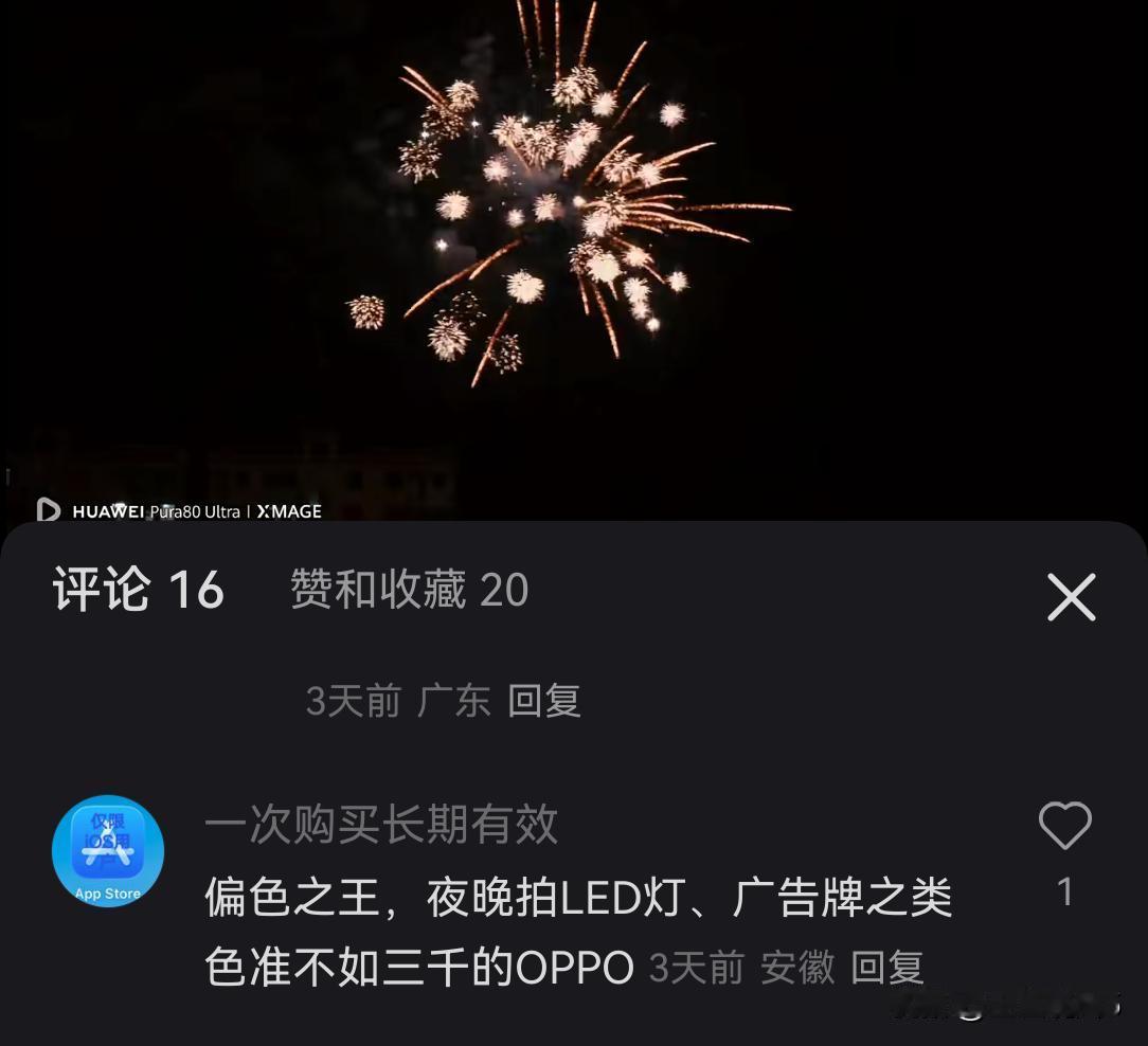 大过年的用HUAWEI Pura80ultra拍的烟花,分享在抖音和小红书,因为视频的画质好,纯净度高,却被一人酸成什么样了 500强粉说赢了,V粉和O粉说偏色王,不如三千的OV手机,你们都说不如了,为了还来评论区?我要是你,我发作品告诉你们,谁才是王者,而不是去评论区告诉我,你才是是王者。 图2,我用Pura80ultra拍这个视频效果,全网你也找不到,让你们难受,我可高兴