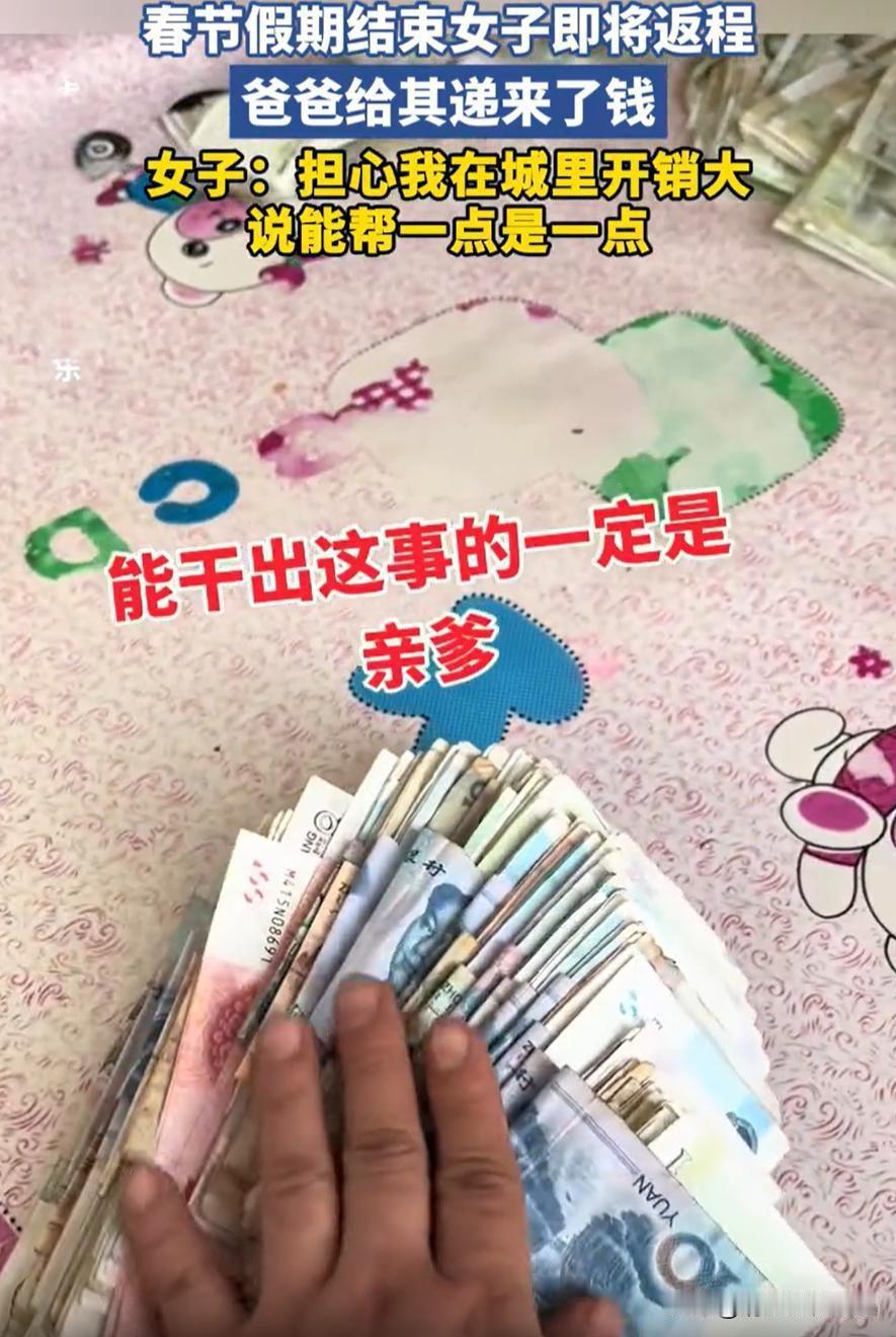 女子返程,爸爸突然递来一叠零钱:城里开销大,能帮一点是一点。 女子接过那叠零钱,心头一阵酸涩。她明白,父亲那份沉甸甸的心意远胜于这些零钱。或许在城市里打拼的她,日常的房租、学费、生活开销都像一座大山压得喘不过气,但父亲那一句“能帮一点是一点”,却让她感受到无尽的温暖与责任。 回想起那些年,父亲从早忙到晚,辛苦劳作只为让家人过得更好。如今,自己在城市里奔波,似乎永远也还不完那些账单。而父亲的这份“援手”,不仅仅是经济上的帮助,更是一份无声的支持与信任。它像一束光,照亮了她前行的路,也让她明白,家庭的纽带,永远是最坚实的后盾。 然而,面对父亲的这份“援助”,她心中也泛起一丝复杂的情绪。是该接受,还是该坚强地走下去?在城市的繁华背后,每个人都在拼搏,都在努力追寻属于自己的梦想,但那份来自家乡的牵挂,却像一根细细的线,牵动着每一个漂泊在外的心。 这件事折射出许多家庭的共同点:父母的无私、子女的感恩与责任。也让我们反思,现代社会的快节奏是否让我们忽略了家庭的温暖?是否在追求个人成功的同时,也要记得那些在背后默默付出的人? 每一次的“零钱”,或许都代表着一份深沉的爱;每一次的“援手”,都在告诉我们:无论走得多远,家永远是心灵的港湾。 让我们珍惜身边的人,用行动去传递那份温暖,也许,简单的一叠零钱,就能点亮一个家庭的希望。