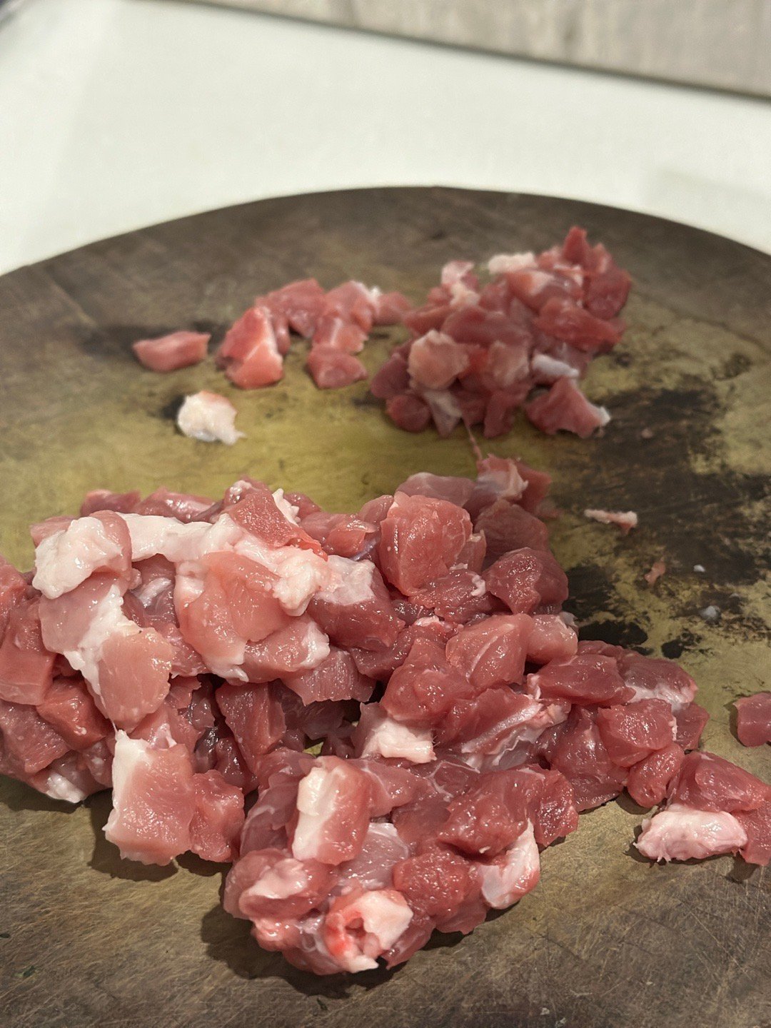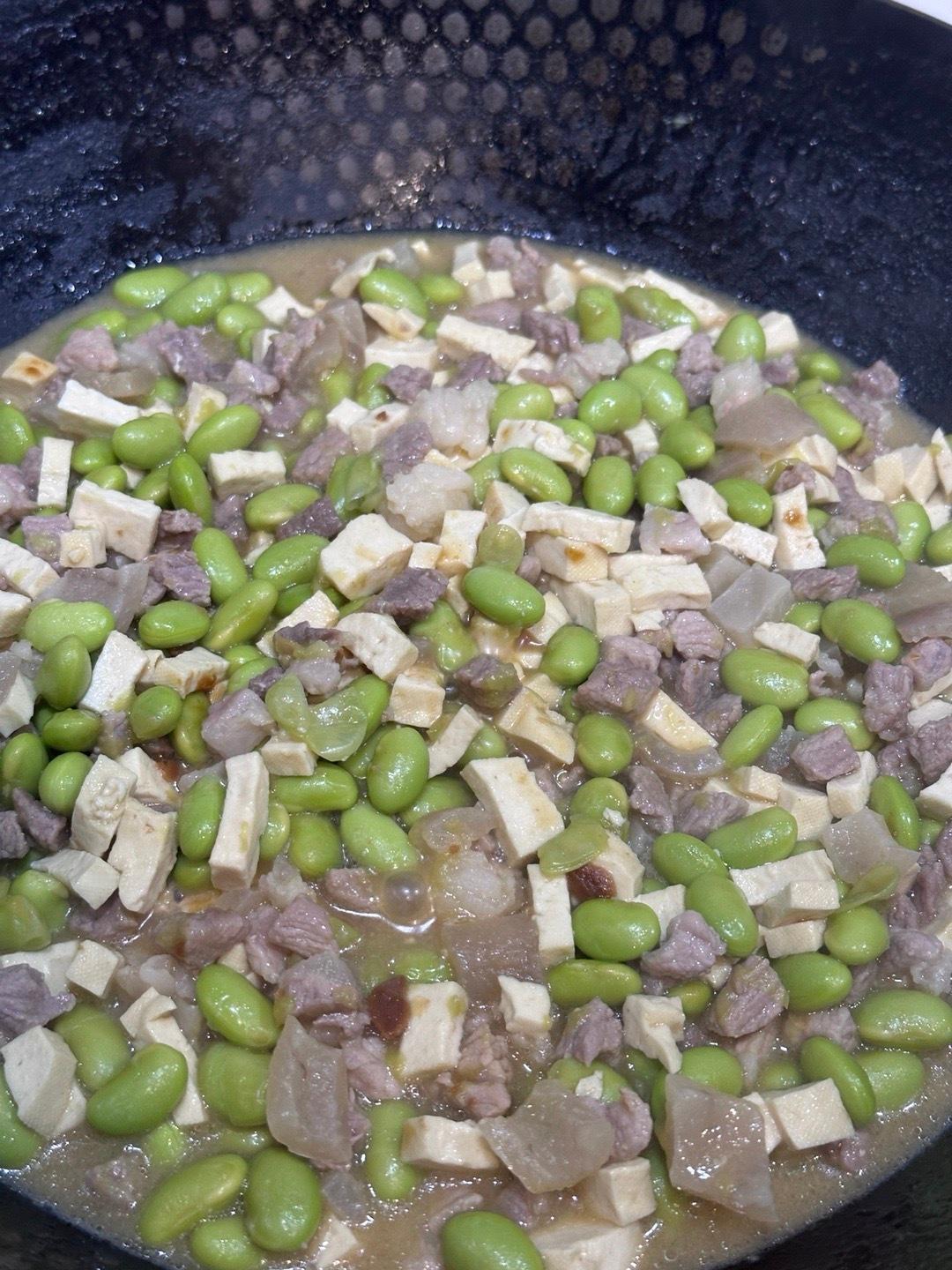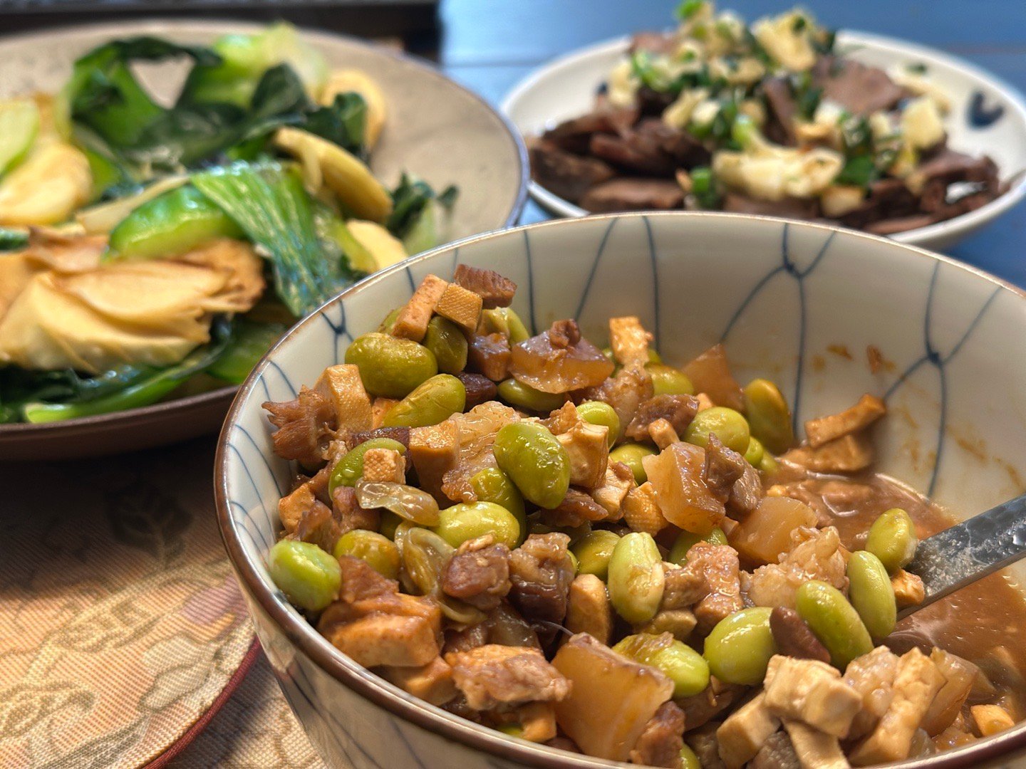 其实是一道特别朴实的家常菜,毛豆、豆腐干和猪肉而已,都是些即便在我小时候物质不丰富的年代也可以获得的日常食材。灵魂成分是肉皮切丁,和甜面酱一起烧。