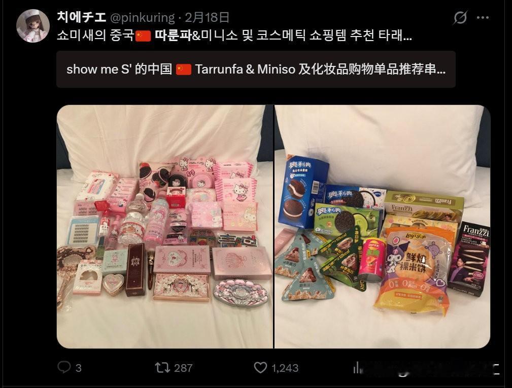 韩国游客来中国旅游都是按网上攻略购买伴手礼,现在队伍扩大不在局限于一些零食,增加了瓜子,纸巾,白酒,牙膏,洗发水等等