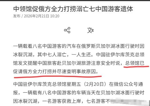中国对俄罗斯施加压力了!俄罗斯对此事要认真处理!2月21日,在发生一辆载着八名中国游客的汽车在俄罗斯贝加尔湖冰面行驶时因冰裂沉湖,七人溺亡事故之后,中方对俄罗斯施加压力了。中国驻伊尔库茨克总领馆对此表示,总领馆第一时间启动应急机制,紧急联系俄方请其尽全力进行救援打捞并尽快查明事故原因。 对于遇难者,俄罗斯方面应该优先组织人力资源进行打捞。这起发生在贝加尔湖奥利洪岛附近的悲剧,已经让七个中国家庭陷入无尽悲痛,俄方的打捞进度和事故调查态度,直接关系到遇难者尊严和家属情感。 中国驻伊尔库茨克总领馆的一系列行动,本质上就是对俄方提出的明确要求和无形压力。总领馆在事故发生后第一时间启动应急机制,紧急联系俄方相关部门恳请全力救援打捞,同时推动事故原因尽快查明。工作人员协调当地领事协助志愿者赶赴现场支援,领事官员也亲自赶往事发地处理善后,这些举措既体现了对同胞的牵挂,更传递出中方对事件妥善处理的坚定立场。 事发地点的客观条件增加了救援难度,但不能成为拖延的理由。车辆坠入的冰缝宽度达到三米,水下深度更是有十八米,冰冷的湖水和不稳定的冰层给打捞工作带来极大挑战。俄方已经通过水下摄像头定位了沉没车辆和七名遇难者遗体,却受限于无正式冰上渡口的现实,只能依靠气垫船开展作业。即便如此,俄方仍需投入足够的专业力量,毕竟每一位遇难者都值得被尽快带回,每一个家庭都在等待亲人的最后告别。 更需要重视的是,这起事故并非偶然发生,俄方在安全管理上的疏漏早已埋下隐患。涉事司机是44岁的当地男子,曾担任儿童足球教练,却私下接单组织冰上游览,所驾车辆并无正规运营资质。事发区域的冰上通道本就未正式开放,当地政府早已明令禁止车辆通行,可涉事司机不仅无视规定,在发现冰面裂缝后还试图加速通过,最终导致车辆瞬间沉湖。更令人揪心的是,这已是一个月内贝加尔湖发生的第二起中国游客冰面伤亡事故,1月28日就有载有中国游客的车辆在未开放冰面倾覆,可见俄方在安全管控上并未吸取前车之鉴。 近期贝加尔湖的异常气候让冰面风险陡增,俄方却未及时强化管控措施。事故发生前当地气温多次回升,甚至打破百年同期高温纪录,温暖天气导致冰层结构极不稳定,水下暗流和甲烷气泡还形成了大量肉眼难辨的暗裂。中国驻伊尔库茨克总领馆此前已多次发布安全提醒,告知中国公民冰面的潜在危险,建议选择更安全的气垫船出行,可俄方在热门观光区域并未有效阻拦违规车辆上冰,也未对非法运营的“黑车”进行严格查处。 俄方目前已启动刑事调查,以“提供不安全服务和疏忽”的罪名追查相关责任人,同时出动五名潜水员和两名紧急情况部救援人员参与打捞。这些行动是必要的,但还远远不够。中方的压力不仅体现在要求尽快打捞遗体,更在于推动俄方彻底排查安全漏洞,避免类似悲剧再次上演。遇难者身份已全部确认,部分家属即将赶赴伊尔库茨克处理后事,俄方需要用高效的行动、负责的态度回应中方的关切,这既是对遇难者的交代,也是对中俄旅游合作的维护。 中国游客选择前往贝加尔湖观光,是出于对当地美景的喜爱和对俄方旅游环境的信任。此次七人溺亡的悲剧,让无数中国民众对贝加尔湖旅游安全产生担忧。俄方必须正视中方的诉求,将打捞工作放在首位,用专业高效的救援行动回应中方的压力。同时要深入调查事故原因,严肃追究相关人员责任,完善冰面旅游的安全管理制度,只有这样才能告慰遇难者的在天之灵,才能重新赢得中国游客的信任。中方的表态从来都不是无理要求,而是基于生命至上的基本准则,俄方理当认真对待、全力落实,让每一份牵挂都能得到回应,让每一个逝去的生命都能被尊重。