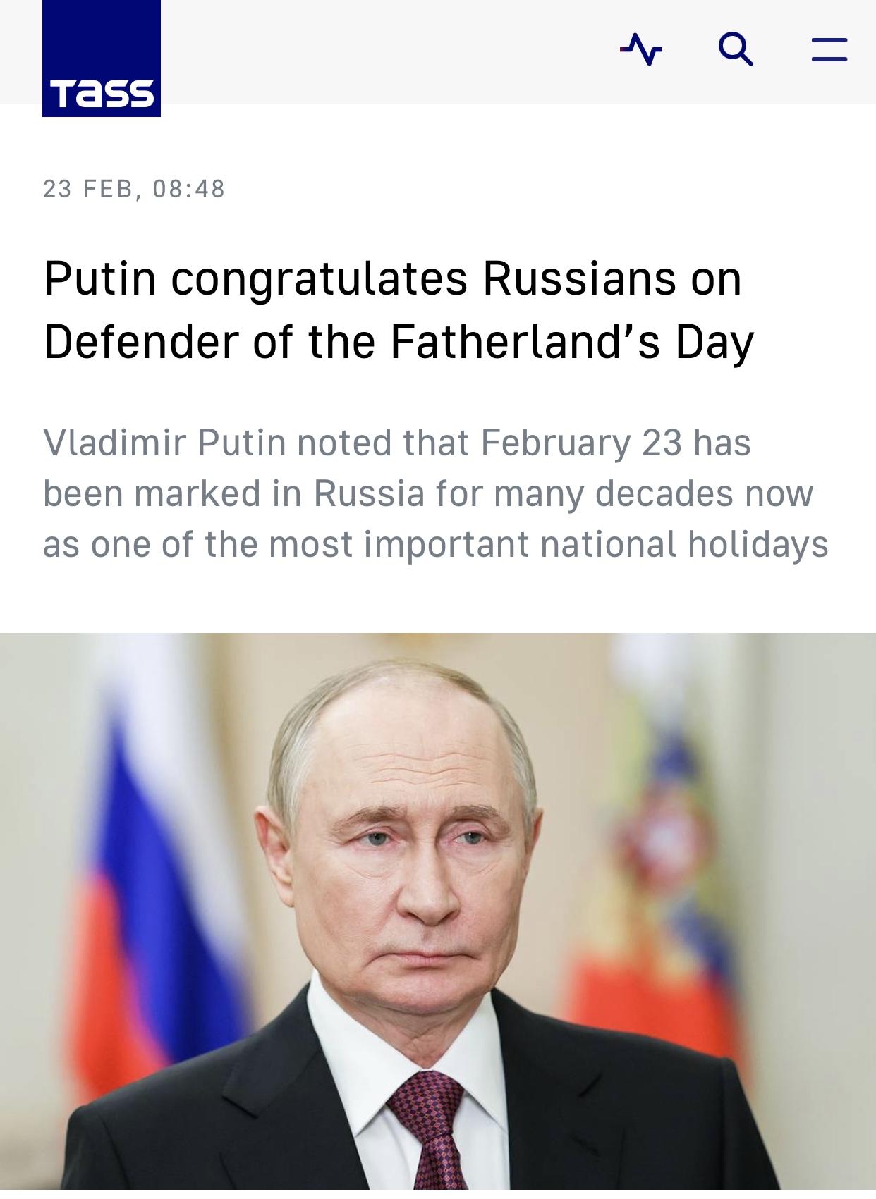 塔斯社:普京在祖国保卫者日向俄全国人民和全军将士表示衷心感谢 塔斯社莫斯科2月23日电:俄罗斯总统弗拉基米尔·普京在祖国保卫者日发表了视频讲话。“同志们,朋友们,在祖国保卫者日,我向俄罗斯全体公民、我们的退伍军人,以及武装部队的军事和文职人员表示衷心祝贺”,这位最高统帅说道。 他接着说,几十年来,2月23日一直是俄罗斯最重要的国家节日之一,象征着人民对捍卫者的真挚热爱,对陆军和海军的自豪感,“对那些献身于祖国、可靠地捍卫祖国主权和安全、忠于军事誓言并认真履行其职业职责的人的热爱”。 “几代人以来,我们一直珍视祖国军事历史的每一个篇章。祖国的建立得益于伟大指挥官的军事艺术,以及士兵和指挥官们不屈的意志和勇气,他们是我们的先行者,在祖国的第一次召唤下,便挺身而出,与战友们在队伍中并肩站在一起”,他说道。 报道说,普京在视频讲话中概述了加强陆军和海军的计划,并特别提到了俄罗斯人民的团结。 “我们的士兵和军官——国家和社会的中坚力量——是真正的爱国者,是具有特殊品质和坚定意志的人”,总统总结道。“我感谢所有俄罗斯军事人员的英勇服役。我向你们的家人和朋友致以最美好的祝愿。俄罗斯人民与你们站在一起,相信你们。节日快乐!” 报道的原标题是《Putin congratulates Russians on Defender of the Fatherland’s Day》(在祖国保卫者日普京向俄罗斯人民表示祝贺)。