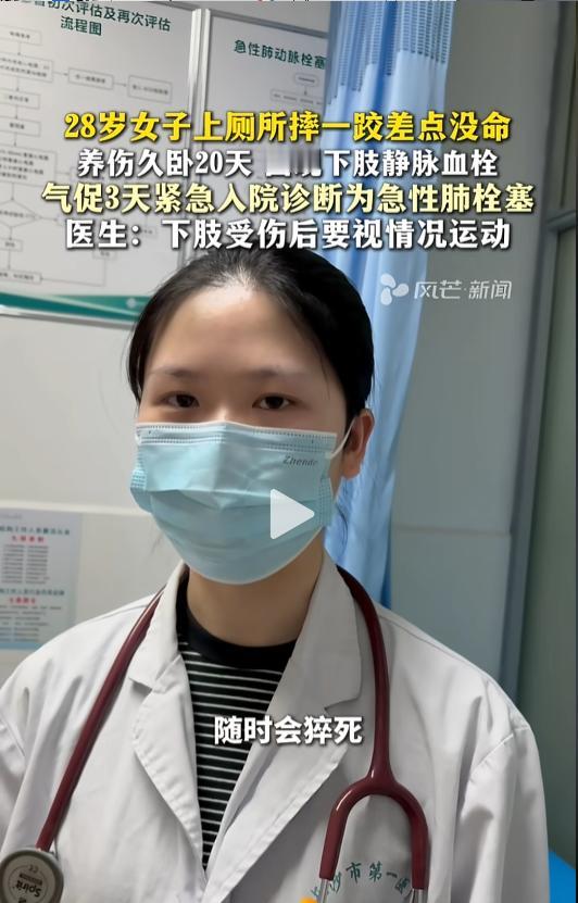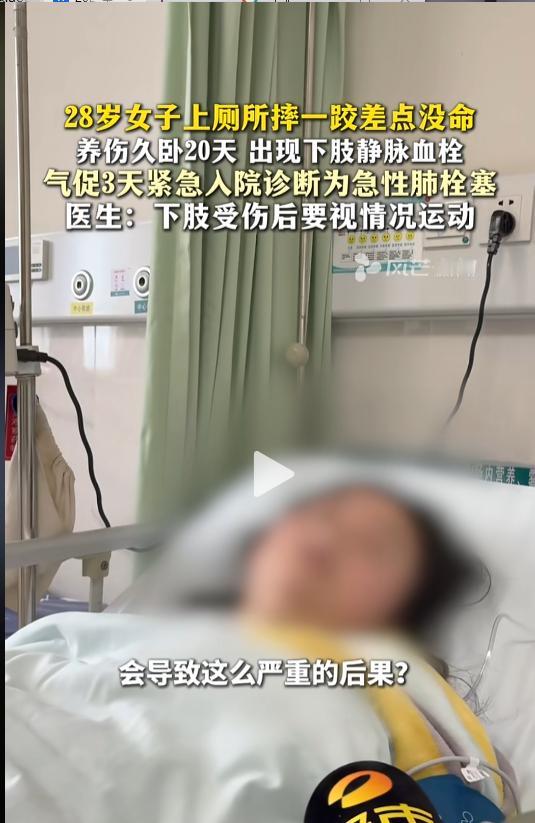“悲剧还是发生了!”近日,湖南长沙,一女子上厕所时不小心摔了一跤,右小腿受了伤。为了养伤,平时都在床上躺着,很少活动。谁知到过了二十来天,竟然开始觉得呼吸困难,到医院检查发现自己竟然长了个血栓!医生:十分危险,有猝死可能! 据媒体2月21日报道,该女子今年28岁,前不久上厕所时摔了一跤,之后就一直搁家里养伤。女子自己说,“休息了十来天,除了吃饭上厕所,都是躺着的”。 本想着这样养着能尽快好起来,现实却给她狠狠上了一课。躺了20多天后,她感觉自己开始呼吸困难,一动就头晕想吐,赶紧去医院做了检查。 医生说,该女子到医院检查时病情已经十分严重,初步诊断是急性肺栓塞,随时有猝死的可能。随后,给女子安排了手术,治疗病情逐渐稳定了下来。 据了解,该女子平时身体比较健康,没有什么基础疾病。像动脉硬化、糖尿病、心脑血管那些高危因素都没有。一般来说是不会这么容易长血栓的,后续还需要进一步查明原因。 网友看后表示,这实在是太吓人了,摔个跤差点把自己送走。细节问题绝不能忽视,养伤时得多听听专业医生的意见,不能因为自己平时身体好就疏于管理。 同时也提醒大家,如果下肢受了轻微的伤,只要不是骨折那种需要完全静养的,还是需要适量运动,对身体的恢复是有帮助的! 信息来源:《28岁女子上厕所摔一跤差点没命 养伤久卧20天 出现下肢静脉血栓,气促3天紧急入院诊断为急性肺栓塞,医生:下肢受伤后要视情况运动