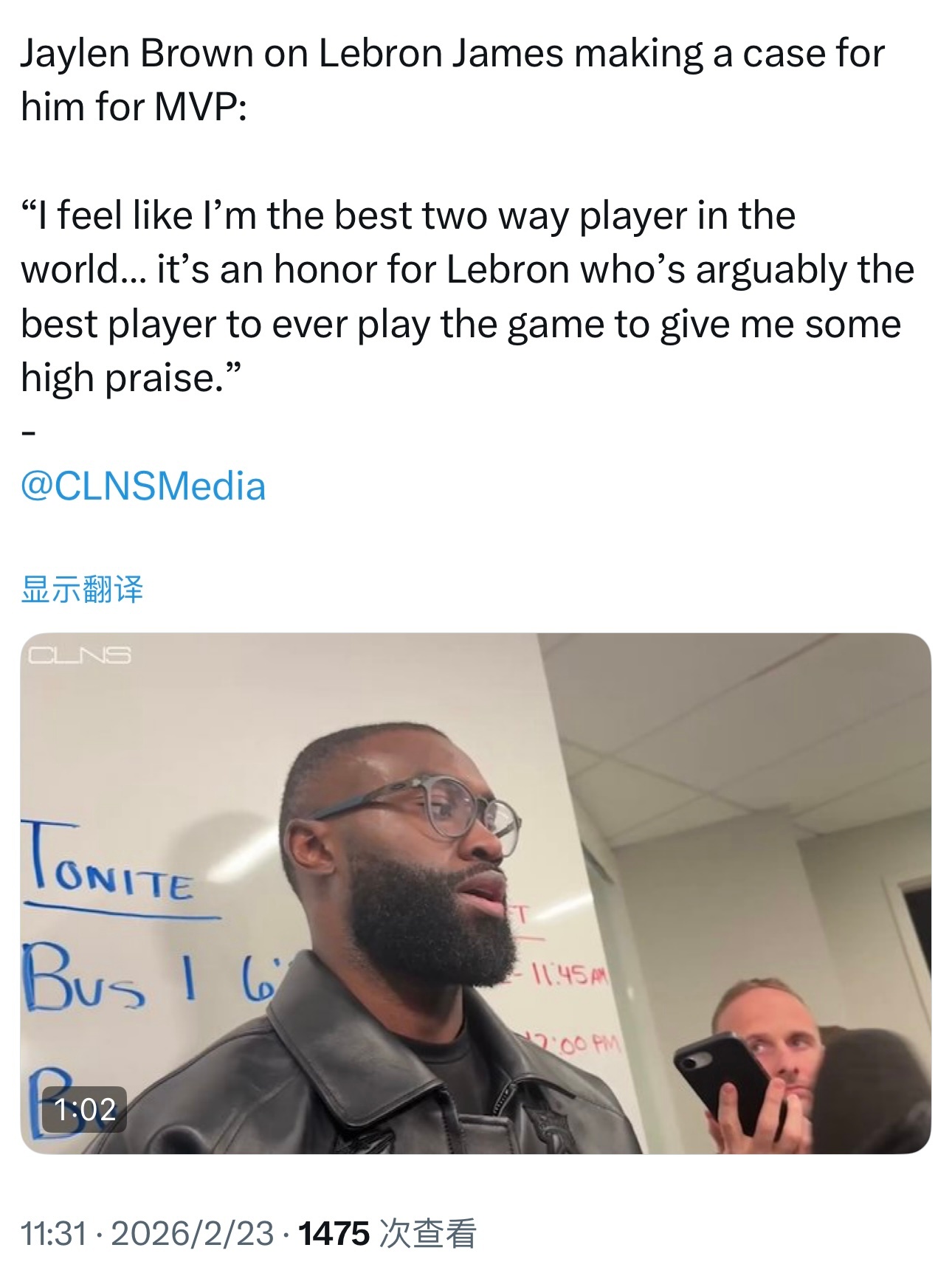 杰伦·布朗在谈及詹姆斯为他争取MVP时表示: