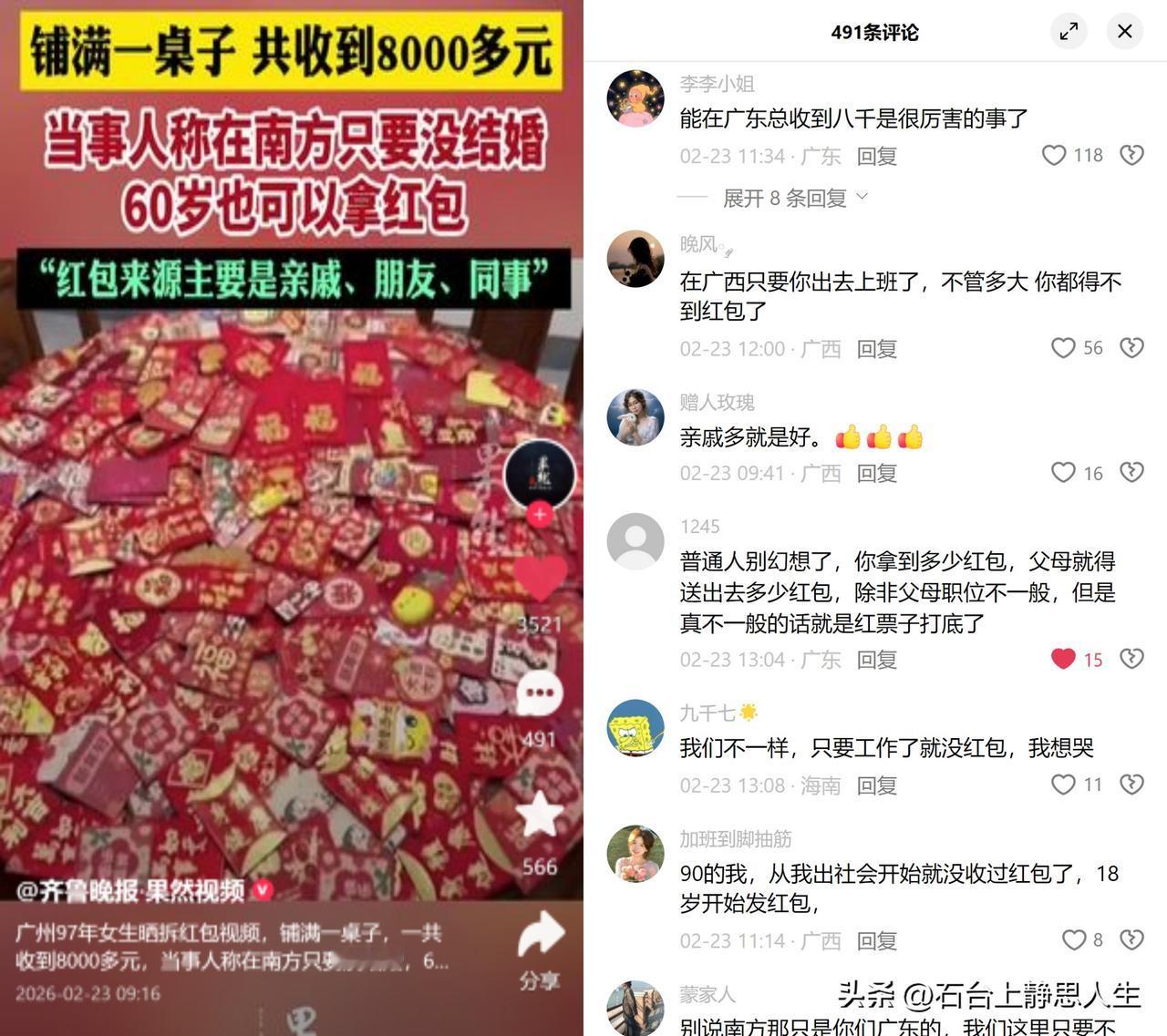 97年广州女生收8000利是! 广州97年李女士晒拆红包,一桌子堆得满满,总共收了8000多,她说广东只要没结婚,哪怕60岁都能收,亲戚朋友同事都会给。 谁懂啊!这和全国红包风气差太远了! 全国压岁钱平均180,可只要一工作,哪怕刚毕业就没资格收了,还得倒贴发红包!广东倒好,平均50块,但不管多大岁数,没结婚就能拿! 看好多人吐槽:我18岁工作就没红包了,上班后连红包影子都没!对比广东60岁未婚还能收,这反差太让人破防了! 别眼红8000,这在广东可是巨款!当地平均才50,8000得收160个红包!说白了就是人家人缘好,真不是普遍现象! 现在好多地方红包早变味了,要么比金额攀比,要么成了人情债,完全忘了是送祝福。广东这操作才懂利是本质!重意头不拼钱,没结婚就能收,这不就是红包界的反内卷天花板吗?