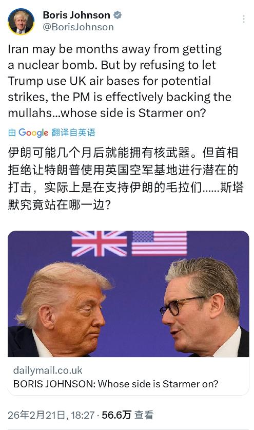英国前首相约翰逊批评现任首相斯塔默,约翰逊今晚(北京时间2月21日晚)发文写道:“伊朗可能几个月后就能拥有核武器。但首相拒绝让特朗普使用英国空军基地进行潜在的打击,实际上是在支持伊朗的毛拉们......斯塔默究竟站在哪一边?” 这事得从近期的一系列动态说起。北京时间2月21日晚,英国前首相约翰逊直接发文发难,把矛头对准了现任首相斯塔默的对外决策。约翰逊明确提到伊朗可能在几个月内就具备拥有核武器的能力,而斯塔默拒绝让特朗普政府使用英国的军事基地开展潜在打击行动,在他看来这种做法本质上是在支持伊朗的毛拉们。 这场争议的核心围绕两个关键地点展开。特朗普政府希望动用的是迪戈加西亚军事基地和费尔福德皇家空军基地,前者作为查戈斯群岛的主岛,原本就有美国驻军,后者更是美军在欧洲部署重型轰炸机机队的重要驻地。根据英美之间长期存在的协议,美方要使用英国境内的基地发动针对第三国的军事行动,必须提前获得英国政府的正式批准,这一规定为斯塔默的拒绝提供了协议层面的依据。 斯塔默政府给出的核心理由是担忧这类军事行动违反国际法。国际社会普遍认可,知悉国际不法行为具体情况仍提供支持的国家,需要承担相应的国际责任,英国方面显然顾虑这一法律后果。而特朗普早在2月18日就通过社交媒体表达了不满,他不仅反对英国将查戈斯群岛主权移交给毛里求斯,还直言英国签订的“百年租赁协议”是重大错误,甚至暗示若伊朗不达成协议,美军可能不得不动用这些基地阻止潜在袭击。 双方的分歧其实不是突然爆发的。早在2月17日晚,特朗普就与斯塔默有过通话,专门讨论了针对伊朗核计划的最后通牒。通话结束后第二天,特朗普就公开批评英国的还岛决定,这一态度转变被外界普遍解读为对斯塔默拒绝授权基地使用的回应。约翰逊的发难更像是让这场外交分歧浮出水面,成为公众热议的焦点。 伊朗的核发展现状是争议的另一重要背景。根据国际原子能机构此前的报告,截至2025年5月,伊朗拥有的丰度60%浓缩铀已达408.6千克,远高于当年2月的274.8千克,虽然制造核武器需要90%以上的丰度,但这种快速增长的趋势确实引发了西方国家的担忧。不过伊朗方面多次表态,本国核活动始终处于国际原子能机构监督之下,且致力于通过外交途径解决分歧,伊朗外长阿拉格齐还在2月20日透露,伊朗正起草协议草案,计划三天内确定后提交美方。 约翰逊的批评并非毫无依据的空谈,他作为前首相,显然关注到伊朗核问题对地区安全的潜在影响。但斯塔默的决策也有其考量,除了国际法层面的顾虑,英国与毛里求斯2025年5月签署的查戈斯群岛主权移交协议也让情况更复杂。根据该协议,迪戈加西亚军事基地由毛里求斯租借给英美两国,这意味着英国在基地使用问题上已不能完全自主决策,需要兼顾多方利益。 这场争议背后还牵扯着英美特殊关系的微妙变化。特朗普政府的强硬立场与斯塔默政府的谨慎态度形成鲜明对比,前者希望借助英国的军事基地强化对伊朗的施压,后者则试图在盟友诉求与国际法准则之间寻找平衡。约翰逊作为保守党的前领袖,与工党出身的斯塔默本就存在政治立场差异,此次发声或许也带有一定的政治博弈色彩,但核心议题仍聚焦于伊朗核问题的应对方式。 国际社会对伊朗核问题的态度呈现明显分歧。部分国家支持通过外交谈判解决争端,认可伊朗和平利用核能的权利;另一些国家则担忧核扩散风险,支持对伊朗采取更严厉的管控措施。斯塔默的决策显然倾向于前者,他更看重通过外交途径化解危机,而约翰逊则更认同军事威慑的必要性,这种政策理念的冲突让“站在哪一边”的质问更具现实意义。 需要明确的是,伊朗方面始终否认发展核武器的意图,强调核计划用于医学和工业等和平用途。国际原子能机构虽然指出伊朗浓缩铀库存超标,但并未证实其存在武器化进程。斯塔默的拒绝并非完全排斥对伊朗核问题的管控,而是反对采用单方面军事打击的方式,这种立场与伊朗外长主张的“唯一解决办法是外交”形成了某种呼应。 约翰逊的批评让斯塔默陷入两难境地。一方面要维护与美国的盟友关系,另一方面要遵守国际法准则和自身的外交承诺,同时还要应对国内不同政治派别的压力。这场争议不会轻易平息,随着伊朗核问题的持续发酵,英美两国在外交和军事领域的协调将面临更多考验。斯塔默究竟站在哪一边?或许答案不在于简单的支持或反对某一方,而在于他所坚持的外交路径能否真正有效遏制核扩散风险,这才是衡量其决策合理性的核心标准。