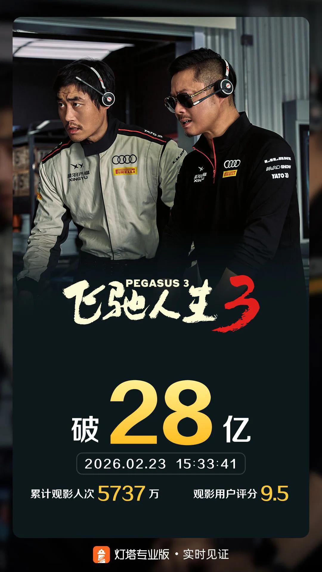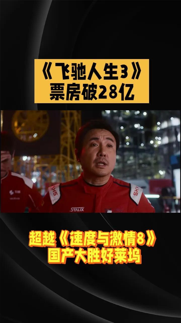 《飞驰人生3》票房破28亿,超越《速度与激情8》。 由韩寒执导,沈腾、尹正、黄景瑜、张本煜领衔主演,魏翔、沙溢、范丞丞、孙艺洲主演,段奕宏特邀主演,张新成、胡先煦、李治廷、白宇帆、周政杰、高华阳特别出演,贾冰、王安宇、陈永胜、冯绍峰、郝瀚友情出演的喜剧电影《飞驰人生3》累计综合票房破28亿,超越《速度与激情8》、《封神第一部》,进入内地影史票房总榜29强;超越《这个杀手不太冷静》,跻身春节档历史14强。 《飞驰人生》系列作为国产赛车电影的代表作,不免会被拿来与好莱坞的《速度与激情》系列进行对比,《飞驰人生》在国内的票房已全面超越《速度与激情》,也找到了属于自己的风格。