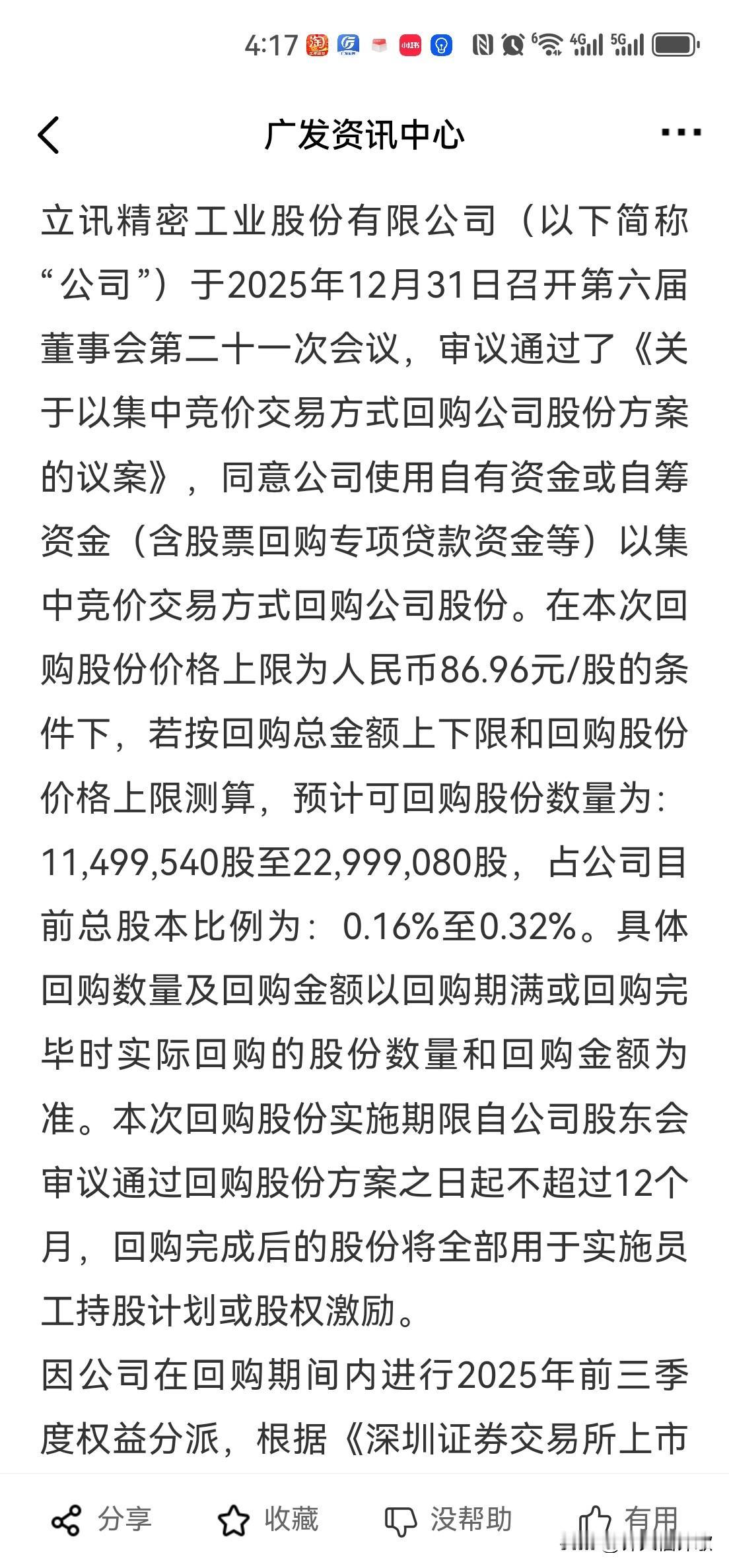 立讯精密大利好!近5亿首次回购+技术面见底,信号太明确🔥 002475立讯精密刚发重磅公告:2月13日首次回购990.06万股,耗资4.999亿元,均价约50.5元,远低于86.6元回购上限!回购股份全用于员工持股/股权激励,长期信心拉满! 📊 最新股价+技术面干货(截至2026-02-13收盘) - 现价:50.80元,涨幅+0.73%,总市值3701亿 - 支撑:49.00–50.00元铁底,多次回踩不破,年线共振强支撑 - 压力:短期53元,中期55–58元 - 形态:日线49–53元窄幅震荡,均线粘合,变盘窗口开启 - 指标:MACD绿柱缩短、KDJ低位拐头,底背离明显,空头动能衰减 - 量能:缩量磨底,抛压减轻,放量站稳53元即反弹确认 💡 核心看点 回购刚启动,总额10–20亿、期限最长12个月,公司真金白银托底,叠加技术面筑底,中期修复预期强烈! ⚠️免责声明:本人非专业投资顾问,以上仅为公告与公开行情整理,不构成任何投资建议;股市有风险,决策需独立判断、自负盈亏! 立讯精密 股份回购 A股