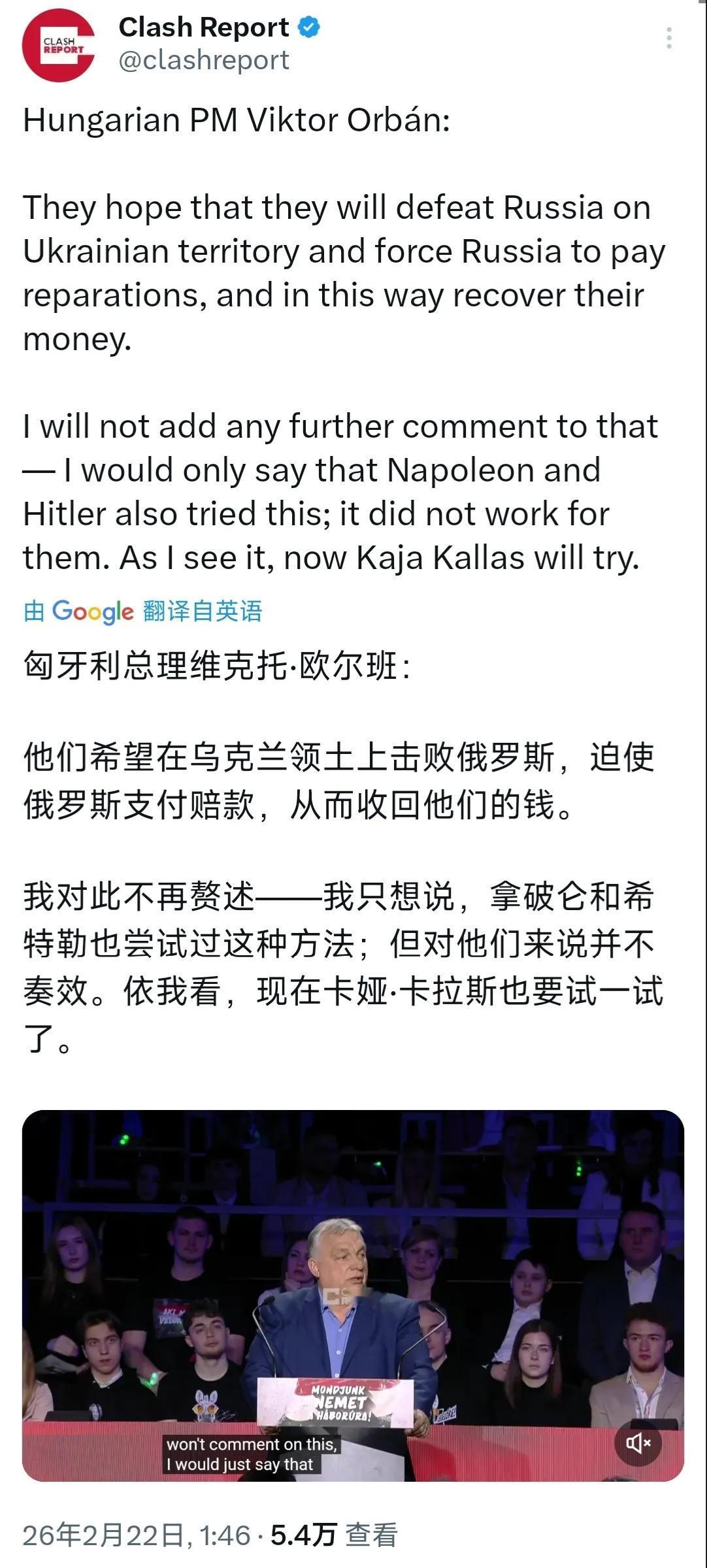 匈牙利总理欧尔班2月22日表示:“他们希望在乌克兰领土上击败俄罗斯,迫使俄罗斯支付赔款,从而收回他们的钱。我对此不再赘述,我只想说,拿破仑和希特勒也尝试过这种方式,但对他们来说并不奏效。依我看,现在卡娅.卡拉斯也要试一试了。” 欧尔班在欧洲国家中算是比较清醒的政治家,面对国际事务中有自己实事求是的独特见解。特别在俄乌冲突问题上,欧尔班一针见血的指出欧洲国家想打败核大国俄罗斯的不现实幻想,坚持与欧洲主流不同立场,这本质上是小国最现实的生存逻辑。因为匈牙利85%天然气、86%石油都依赖俄罗斯,一旦断供,经济与民生将崩溃,这是欧尔班从本国利益出发最现实的“保命牌”。 其实,欧尔班还曾批评欧洲国家称:“欧洲已失去参与俄乌冲突谈判的资格,因为欧洲官员就像美国的仆人一样,提不出什么有价值的建议。”可见,在大国博弈中,没有永恒的站队,只有永恒的国家利益,这一点欧尔班比多数欧洲领导人政治立场坚定、并有独特见解。