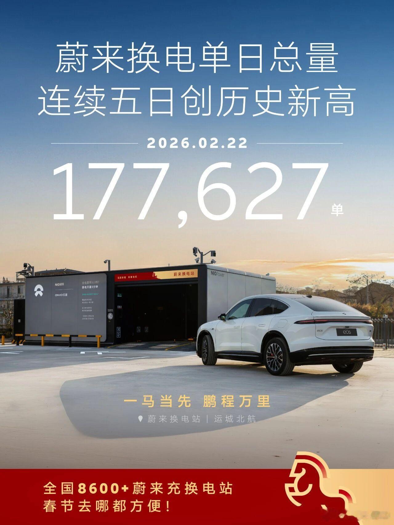 从年初二到年初六,蔚来单日换电次数已经连续 6 天创新高了,单日的记录已经拉到 17.76 万次了,远超去年 14.66 万单的记录。
