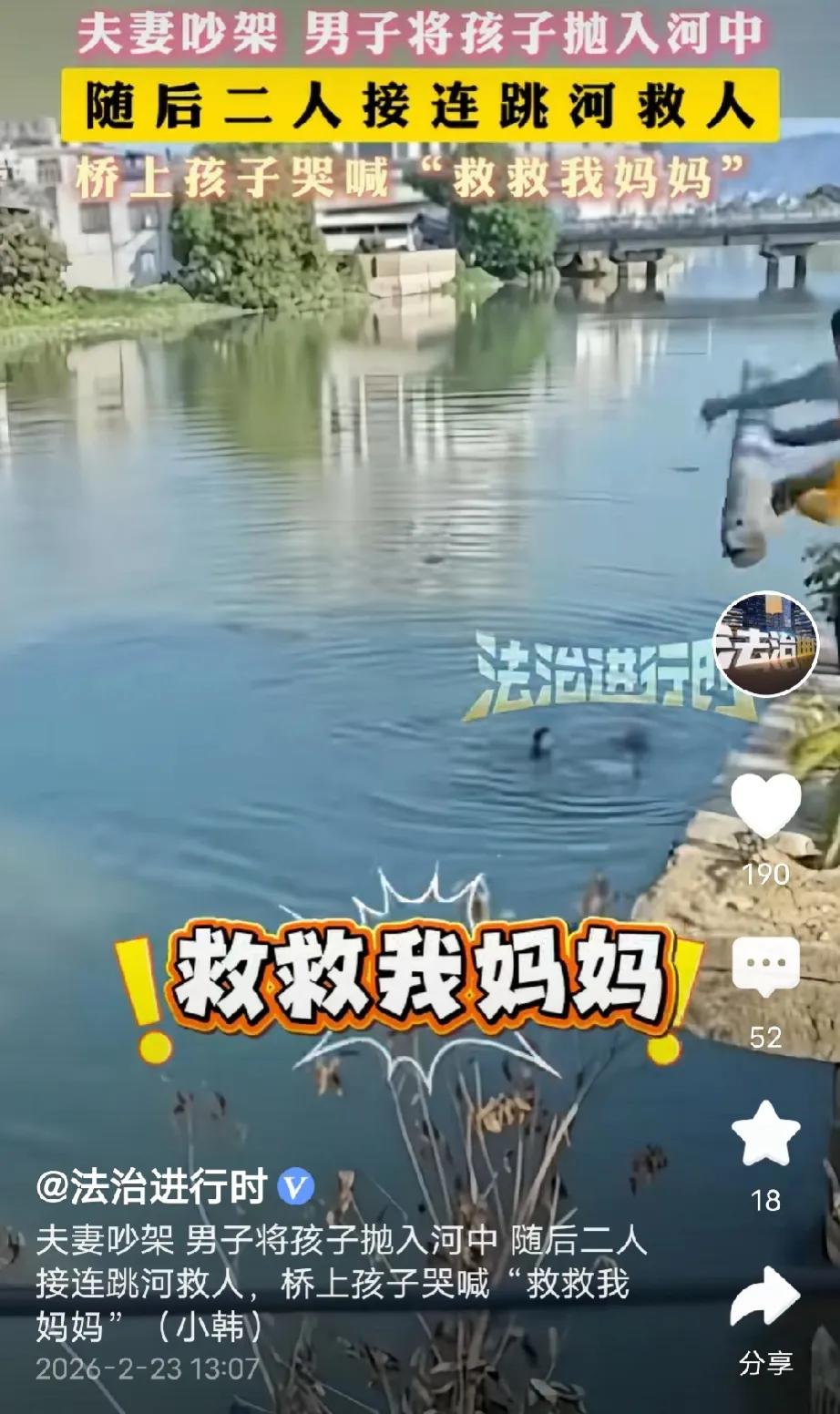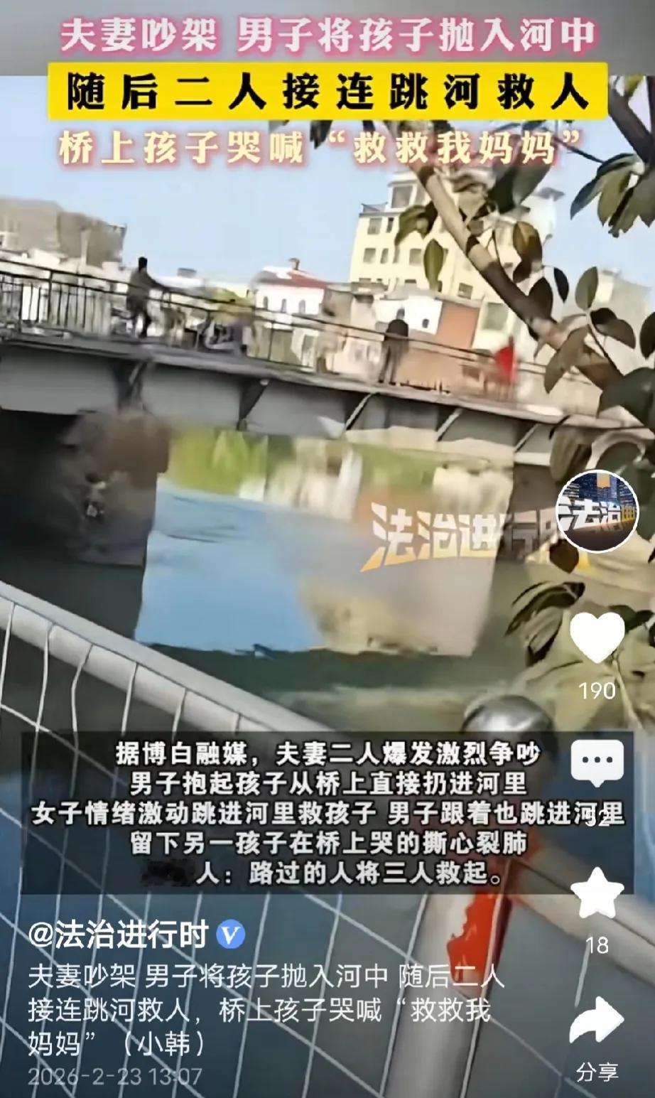 这是亲爹干的吗?广东潮州,男子和妻子带着两个孩子出门,走到大桥上时,夫妻俩突然起了争执,男子火冒三丈,指着妻子大骂,妻子也不甘示弱,跟男子吵了起来,没想到,男子一气之下,抱起最小的孩子直接从桥上扔进河里。妻子吓得边往河里跳,边大喊“救命”,接着男子也跟着跳进河里。网友:虎毒还不食子呢,这是人干的事吗? 据报道,潮州一男子带着老婆和两个孩子出门玩,一开始一家四口还算和谐,两个孩子在跟前跑,夫妻俩边聊天边跟在孩子后面。 也不知道什么原因,夫妻俩走着走着,突然就为了一点小事吵了起来,他们越吵越凶,你不让我,我不让你。 当一家四口走到大桥上的时候,夫妻俩依然争吵不断,而且还越吵越凶。 就在妻子想着带2个孩子先行一步离开的时候,不知道男子心里怎么想,他突然抱起那个最小的孩子,从桥上直接往河里扔。 妻子看到这一幕直接吓傻了,愣了2秒,反应过来后,她二话不说直接跟着跳进河里,她边跳嘴里边大声呼喊“救命啊!” 男子可能是后悔了,赶紧跟着跳进河里,游向妻子和孩子。 剩下的另一个孩子被爸爸的举动吓得哇哇大哭,此时的他应该很害怕,很担忧,他应该恐惧占满心里了吧。 他不停地哭,不断地喊“妈妈、妈妈,快救救我妈妈”,那一声声“妈妈”让人听了心疼不已。 好在最后在好心人的帮助下,合力救起了男子一家三口。 有人说,这个男的情绪太不稳定了,夫妻之间再怎么争吵,也不能把怨气撒在孩子身上,应该尽早远离那种情绪不稳定的男人。 有人说这个男的根本不配当爸爸,夫妻吵架是大人的事,再大的火气也不该拿无辜的孩子撒气。孩子那么小,什么都不懂,却要被亲生父亲亲手扔进河里,那一刻该有多绝望、多害怕。 虎毒尚且不食子,可他在暴怒之下,连最基本的人性和父爱都抛到了脑后。他一时冲动的举动,差点毁掉一个完整的家,给孩子留下的心理阴影,可能一辈子都抹不掉。 妻子奋不顾身跳河救孩子的样子,才是真正的母爱;而他事后再后悔、再跟着跳下去,也弥补不了那一刻的残忍。情绪失控到能对亲生骨肉下手,这种人真的太可怕,也太不负责任。 希望孩子平安无事,也希望这样的悲剧永远不要再发生,更希望每一个父母都能管住自己的脾气,别让最亲的人,伤孩子最深。 他的这种极端行为,已经突破道德底线,涉嫌违法犯罪。 《刑法》第232条规定,故意杀人的,处死刑、无期徒刑或者十年以上有期徒刑;情节较轻的,处三年以上十年以下有期徒刑。 本案中,男子因夫妻争吵,故意将年幼孩子从桥上扔进河里,桥下水深具有高度生命危险,其行为属于非法剥夺他人生命的实行行为,主观上至少具有放任孩子死亡结果发生的间接故意,完全符合故意杀人罪的构成要件。 虽然后续他跳河施救且孩子被好心人救起未造成死亡结果,但这仅能作为犯罪未遂或情节较轻的量刑情节考虑,不影响本罪的成立。 《刑法》第260条规定,虐待家庭成员,情节恶劣的,处二年以下有期徒刑、拘役或者管制;致使被害人重伤、死亡的,处二年以上七年以下有期徒刑。 本案中,男子作为孩子的父亲,本应履行监护保护义务,却因情绪失控对亲生幼儿实施极端暴力行为,严重摧残孩子的身心健康。 结合其行为的手段残 忍性、针对对象的特殊性以及对孩子造成的巨大心理创伤,已远超偶尔的家庭教育不当,属于虐待家庭成员中“情节恶劣”的情形,依法应当以虐待罪追究其刑事责任。 对此,大家怎么看?