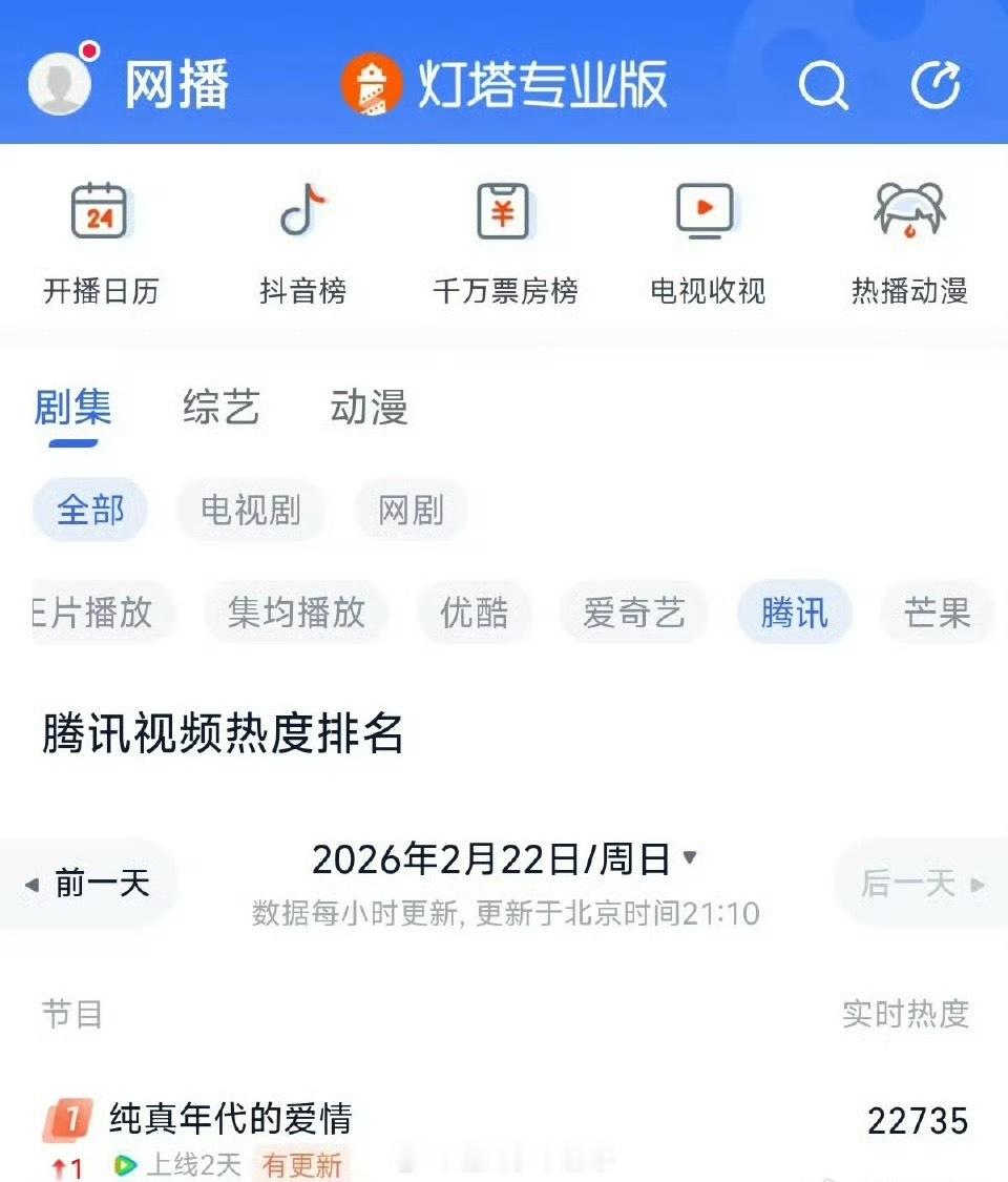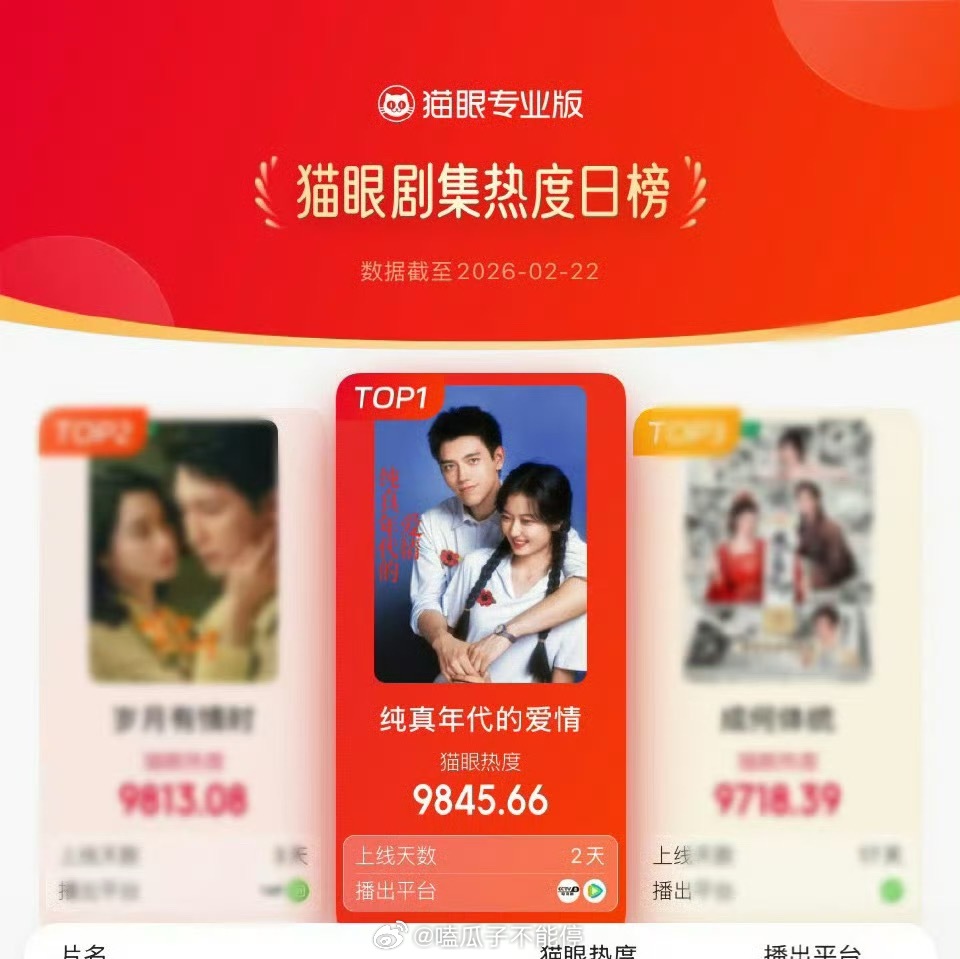 陈飞宇、孙千《纯真年代的爱情》开播第二天全平台热度断层登顶了,猫眼灯塔酷云多榜单