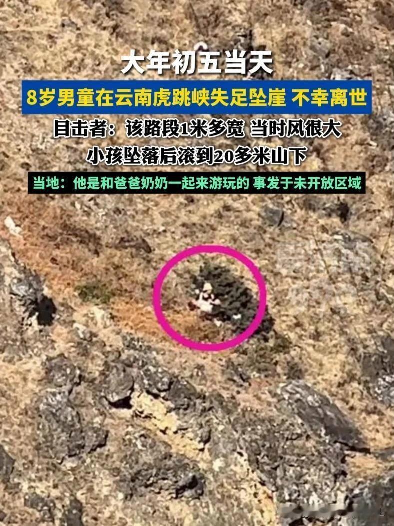 虎跳峡那地方! 真不是带孩子去瞎逛的景区! 看着视频里那位父亲,站都站不稳,踉跄着捂着嘴,完全不敢信眼前这一幕。 地上躺着的,是他8岁的儿子,满脸是血,一动不动。 这时候谁还顾得上什么急救常识? 虽然都知道高处坠落不能随意搬动,怕二次伤害,但这父亲硬是把趴着的孩子翻过来,死死抱在怀里失声痛哭。 估计那一刻,作为父亲的直觉告诉他,什么都已经晚了,他只想再抱抱孩子。 我就纳闷了,那一米来宽的路,又是悬崖又是大风的,成年人走都腿软。 非得带着个正是调皮年纪的孩子去涉险徒步? 是为了那点征服欲,还是为了满足大人的爱好? 这一失足,毁的是整整三代人。 尤其是孩子的妈妈,十月怀胎鬼门关走一遭,八年的心血,全在那一瞬间成了泡影。 这代价,实在太大太大了。 带娃出行,我只说最实在的三句话。 第一: 封闭牌子=生死线,看见就掉头,别犟。 第二: 娃小不玩险,8岁正是乱跑的年纪,别带去悬崖边。 第三: 网红野线别跟风,好看的照片背后,全是看不见的风险。 很多家长爱说:我就想带孩子见见世面。 世面不是拿命换的。 安全的公园、博物馆、正规景区,一样长见识。 非要去野山、野峡谷、未开发路线,那不是爱,是赌。 赌赢了发个朋友圈,赌输了,家就碎了。 2026年出门,愿每一个孩子都平安回家。