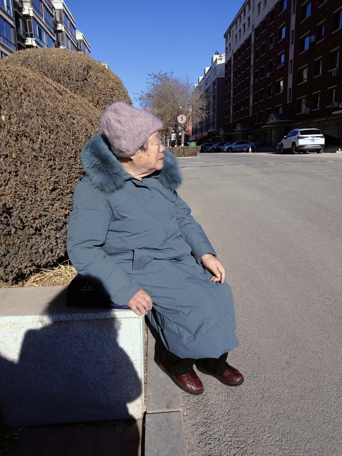 冬日暖阳下,慈祥婆婆的微笑。九十岁的婆婆在阳光下晒太阳。晒太阳老人晒我的婆婆