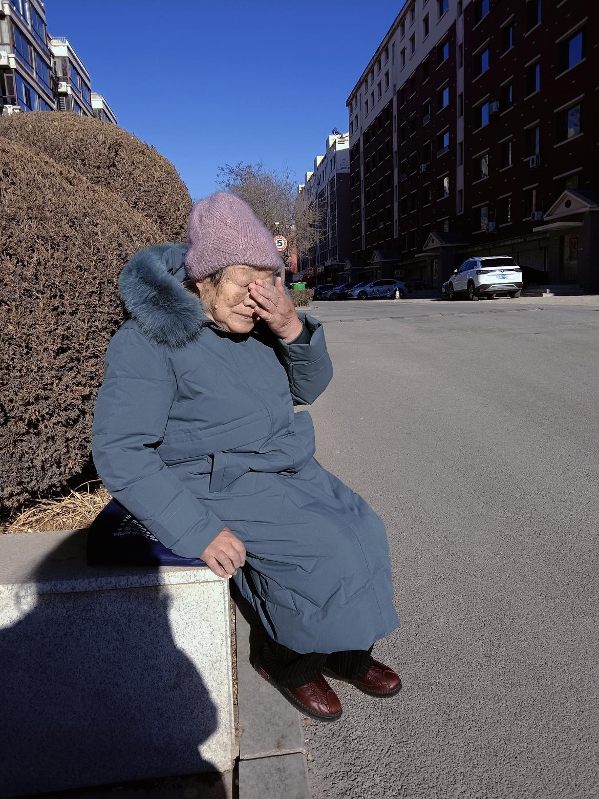冬日暖阳下,慈祥婆婆的微笑。九十岁的婆婆在阳光下晒太阳。晒太阳老人 晒我的婆婆 九十几婆婆