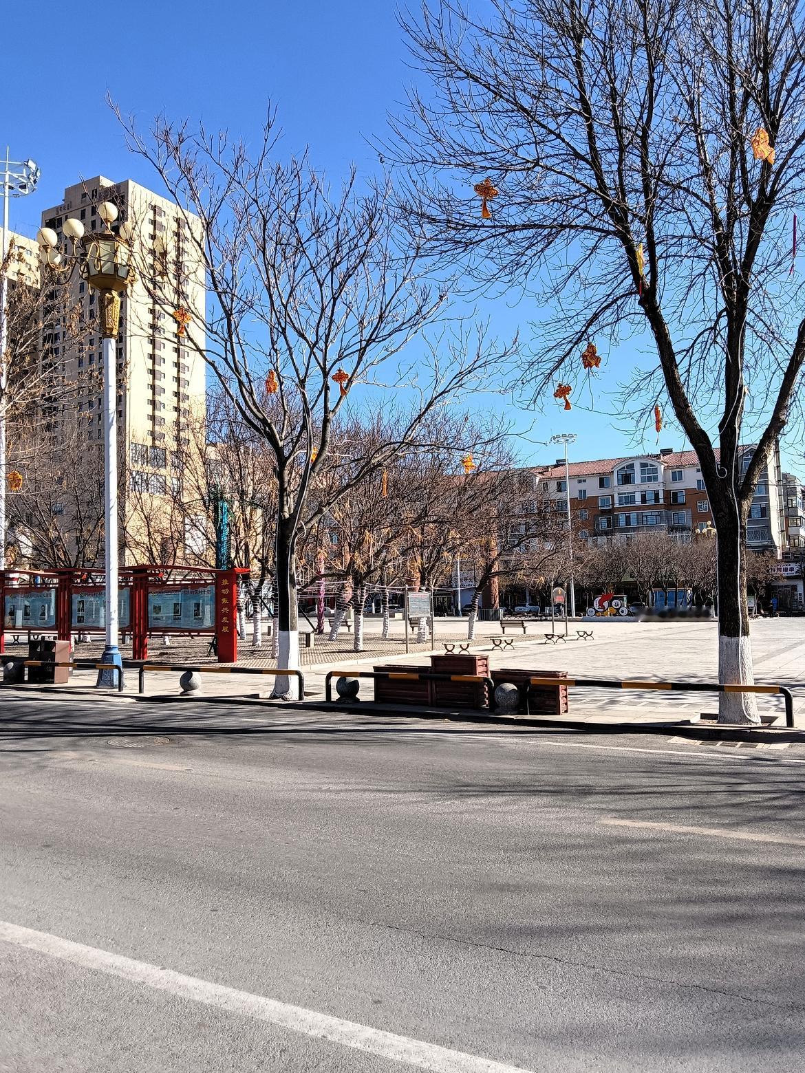 晴天公园里,树木光秃秃的。