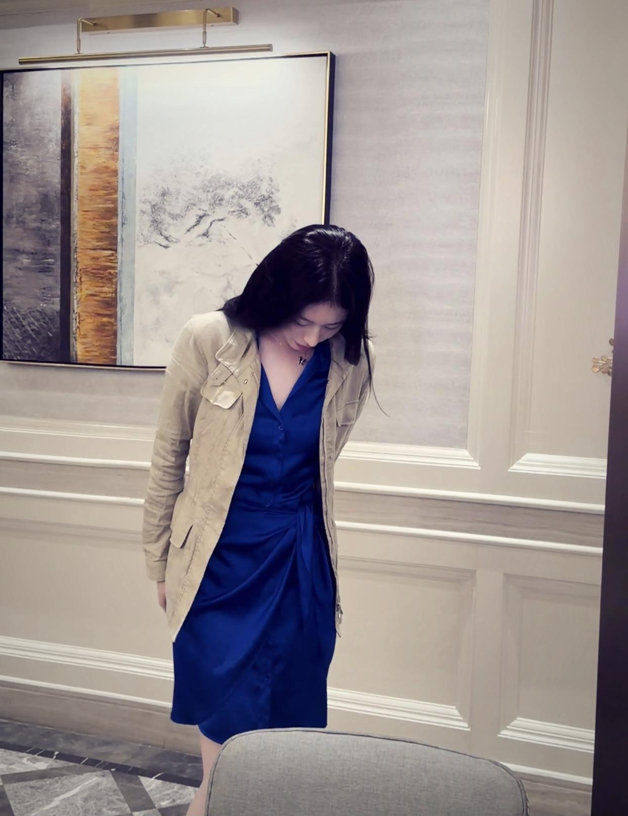 有哪些美女让人过目难忘?优雅蓝裙搭配米色外套,尽显知性美!