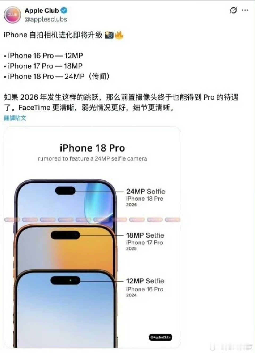 iPhone18Pro像素前瞻最新爆料说,这次Pro系列的摄像头会有明显升级。后置主摄依然是4800万像素,但加了可变光圈,能手动调景深虚化,长焦也升级到4800万像素的大光圈潜望镜。前置摄像头则从1800万直接跳到2400万,自拍和视频通话更清晰了。配合屏下Face ID缩小灵动岛,拍照和视觉体验应该都有提升。