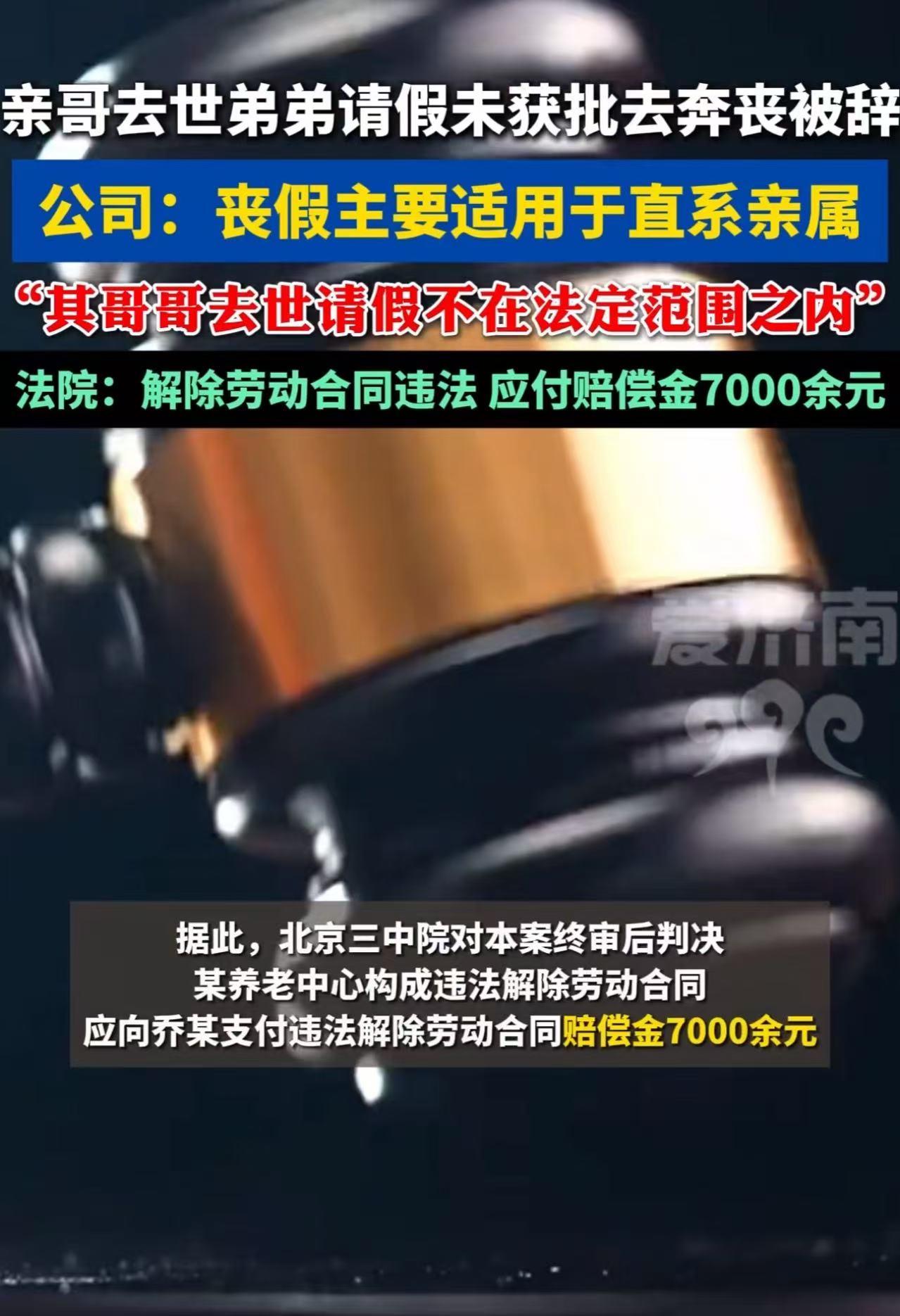 “我亲哥去世,我去奔丧被开除,这还有人性吗?”哥哥不幸去世,弟弟请假未获批去奔丧被辞!公司:丧假主要适用于直系亲属,且其未经同意请假!网友:公司制度不能没有人性!谁都会有这种情况! 2023年4月,45岁的乔师傅经熟人介绍,入职北京一家养老中心当厨师。 他话不多,干活实在,每天天不亮就到厨房熬粥、蒸馒头,给几十位老人准备热乎早饭。老人们都夸:“小乔做的菜软烂入味,像自家孩子一样贴心。” 可谁也没想到,这份安稳的工作,竟因一场突如其来的家庭变故戛然而止。 同年8月19日,乔师傅接到老家电话:亲哥哥突发重病,已下病危通知。 他立刻发信息向后厨经理高某请假15天:“我哥快不行了,我想回去送他最后一程。” 高某回复:“太长了,批不了。” 乔师傅马上退让:“那我不带薪,行不行?” 对方没再回话。 第二天晚上,噩耗传来——哥哥走了。 乔师傅强忍悲痛,给高某发最后一条消息:“高经理,我原想明天再干一天,现在来不及了,今晚就得赶回去,明早坐火车走,特此请假。” 他以为,人之常情,单位会理解。 可等他8月25日风尘仆仆返京,准备次日复工时,高某冷冷回复: “下周一找我,写辞职信,明天不用来了。” 三天后,一封正式《辞退通知书》寄到他手上,理由赫然写着: “擅自离岗,未说明亲属关系,未获批准,严重影响工作安排。” 更刺眼的是,养老中心强调:“丧假只适用于父母、配偶、子女,兄弟不在法定范围。” 乔师傅懵了。 他在养老院天天给别人的父母做饭,自己的亲哥哥走了,连请几天事假都不行? 他申请劳动仲裁,败诉;又起诉到法院,一审仍判他输。 直到案件上诉至北京市第三中级人民法院,事情才迎来转机。 法院在判决书中写道:“解除劳动合同是最严厉的惩戒。乔某因亲哥哥病危去世,请不带薪事假,属人伦常情。用人单位不仅拒绝,事后还以‘擅自离岗’为由直接开除,有违公序良俗。” “尤其该单位是养老机构,本应更懂‘孝’与‘情’之重,却对员工的至亲之痛如此冷漠,实难令人接受。” 最终,法院终审判决:养老中心违法解除劳动合同,赔偿乔师傅7000余元。 【网友热议】 “养老院天天喊‘尊老爱幼’,结果员工亲哥死了都不让请假?你给老人端汤送药,谁给你端一碗热汤?” “理解归理解,但制度就是制度!厨房就两个人,他一走五天,老人吃饭怎么办?提前沟通、找替班,哪条做不到?直接走人就是失职!” “法律没规定兄弟算丧假,但《民法典》第8条明确:民事活动不得违背公序良俗。法院这次判得好——法律可以冰冷,但社会不能没有温度。” 我认为,这场官司表面是“丧假之争”,实则是现代职场对人性底线的试探。 企业总说“制度面前人人平等”,可当制度与人伦冲突时,真正考验的,不是员工是否守规,而是企业是否有心。 尤其讽刺的是,涉事单位是一家养老中心—— 一个本该最理解“亲情”“告别”“临终陪伴”的地方,却用最机械的方式,切断了一个男人送别至亲的权利。 法律或许没强制给“兄弟丧假”,但文明社会的基本共识是:一个人,在亲人离世时,有权悲伤,有权告别,有权暂时离开岗位。 若连这点空间都不给,那所谓的“高效管理”,不过是披着制度外衣的冷血。 更值得警惕的是,当越来越多企业把“服从”当作忠诚,把“不请假”当作敬业,我们正在培养一代不敢哭、不敢痛、不敢做人的打工人。 乔师傅赢了7000块钱,但真正该反思的,是那些把员工当成工具,却忘了他们也是有血有肉的人 的管理者。 愿所有奔丧路上的人,不再被一纸“制度”拦在亲情之外。因为—— 一个连亲人都不能送别的人,又怎能真心照顾别人的父母?