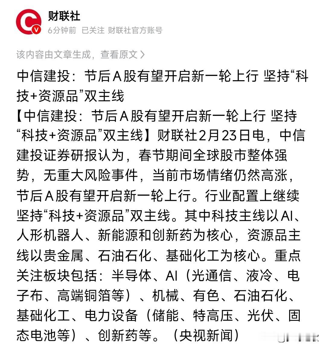 中信建投给出了接下来A股的投资建议 中信建投认为:A股接下来还是会开启一波上涨行情,主要投资主线还是以科技和资源股为主。 在2025年科技股已经涨了一年,随着外围市场的干扰,以人工智能为首的个股遭到华尔街的抛售,A股科技股也出现了大幅度的回调,不管是半导体,人工智能,还是机器人都受到了一定的影响。 但随着春晚机器人的效应,节后机器人有望迎来一波反弹,人工智能概念还是需要观察外围。 至于资源股,石油板块是有确定性上涨的空间,主要就是伊朗的地缘政治冲突可能会使全球石油紧张。 再一个就是涨价概念,黄金,白银在这个假期疯狂上涨,还有稀土,小金属的稀缺涨价,这些都是节后有确定性上涨的板块。